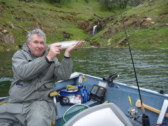 Dangerious and I decided to leave the yaks at home due to predicted weather and wisely? took the tin can (or as I call her Bauxite Betty). This was only my second time astride Betty since I bought her 9 months ago as I am addicted to the crack called yak. She is a mid 80’s 14 ft Klamath deluxe with 25 HP merc tiller steer 2 stroke. I mounted a new Scotty downrigger earlier this week. Great setup for 2. Stopped and dropped coin at the Glory Hole in exchange for goods and launched in light rain and wind. Saw some recent pics at GH of some TOAD spots.