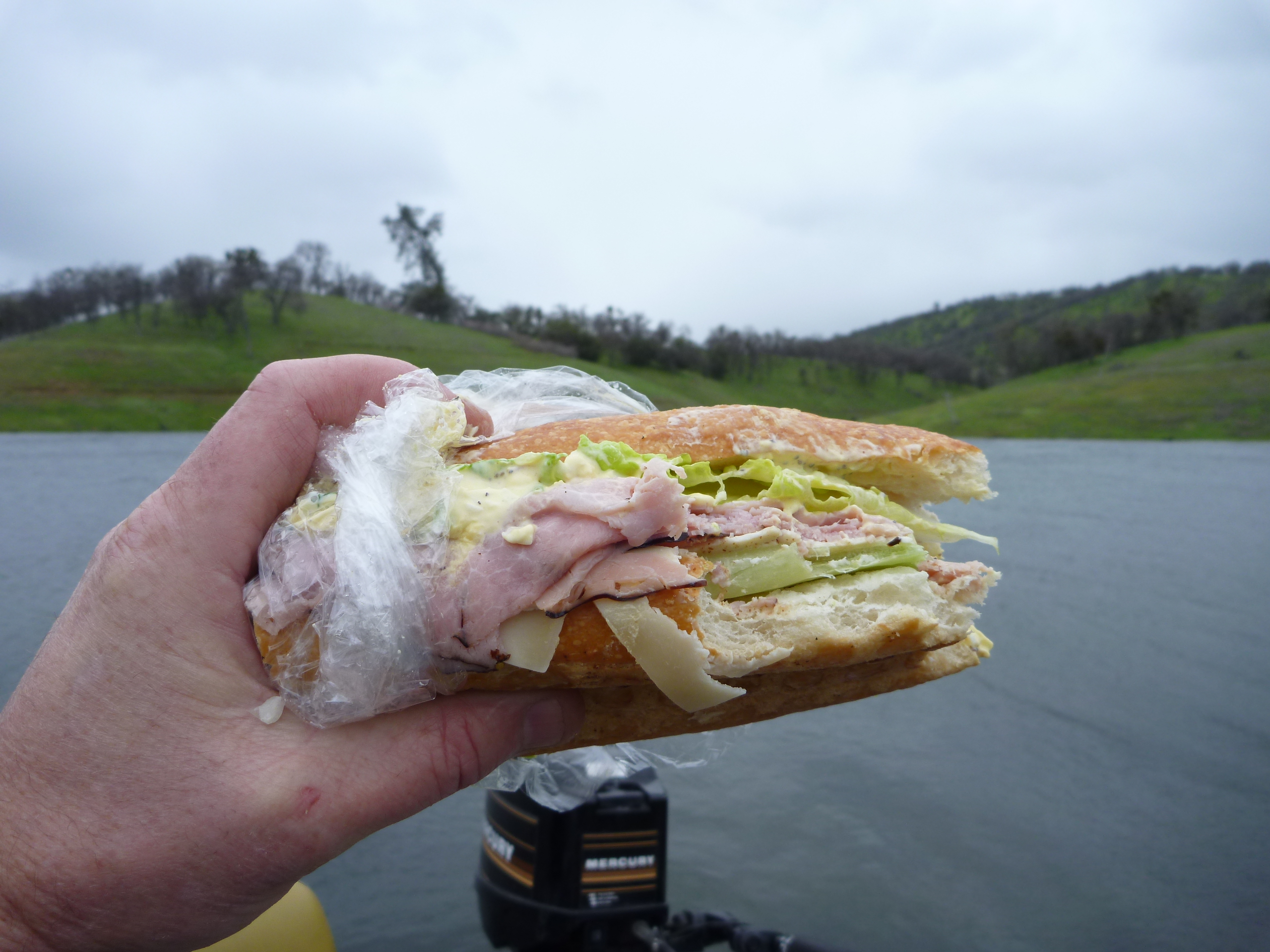 Wanted to stay back there but noticed the wind was picking up so we headed back towards the ramp. Got our asses kicked with a wet ride from a stiff quartering wind wave around 3-4 feet. I hate tiller steering in slop. Ducked into the houseboats for lunch. Debra’s sammys killed as usual.