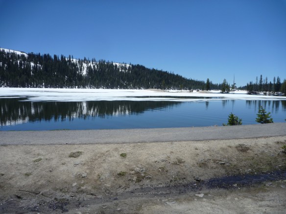 6 ft of snow piled up at road edge. Great breakfast at the Alpine lodge. A few belly boaters there with maybe 15% of the lake iced out.