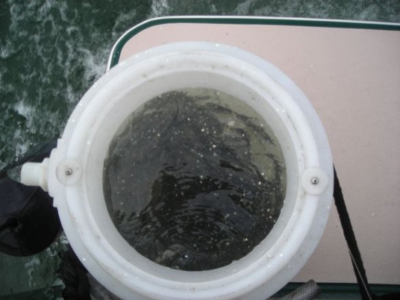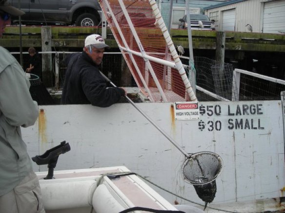 We motor to Angel and he was spot on. Arrived around 8:30 to see 11 party barges in play and numerous skiffs. Nets going all around. Thelma calmly cranks up a 10# fish.