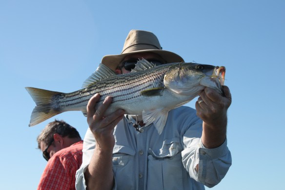 Ken and Randy joined me for our first exploratory striper trip of the fall. We tractor launched at Russos at 10:00 am to a minus tide slack. Wind was a little stronger than the 10-15 MPH predicted but we decided to pound it west even though Randy had caught a couple in Franks 2 days before. We rolled to Broad Slough and tried to setup at the entrance to the racetrack. Was tough to stay positioned with a strong NW wind and chocolate milk so we ducked inside. In one of the bays inside Sherman Randy gets a look on the fabulous Bone Super Spook and gets batted 4 ft into the air before the fish commits to the relationship. This was in about 3 ft of water so we saw her an easy 10 lber. Unfortunately she popped off. Tried half a dozen spots in SHerman with rattle traps, spooks, punkers, and pointers. Moved to the SJ near Lauritzens and a small slough east of there with a great incoming tide. Moved on to the break for some frogging and got plenty of humps but they would not eat. Blew back to Franks around 4:00 at the end of the tide. Picked up a few to maybe 8 lbs but not wide open by any means.