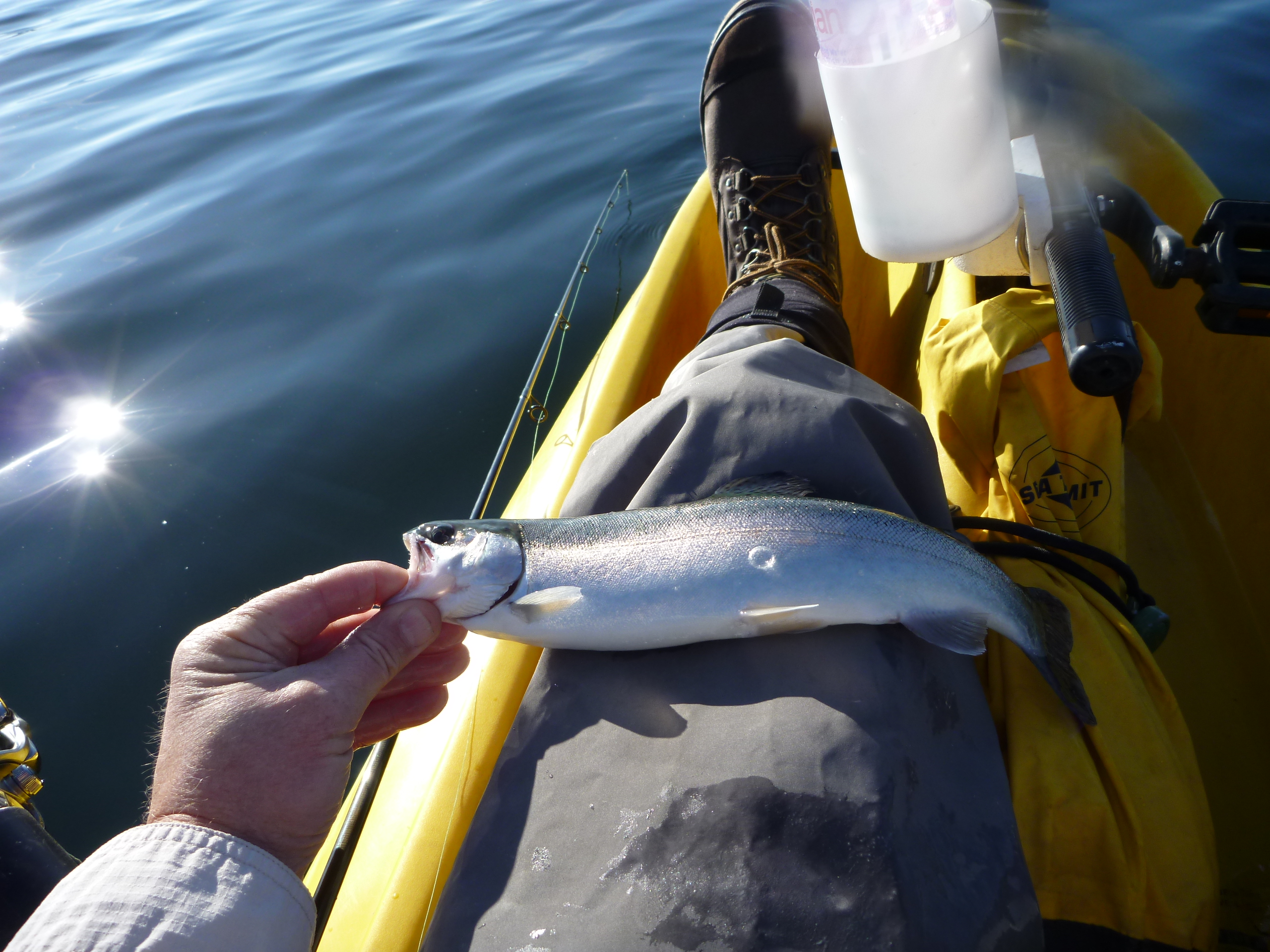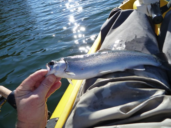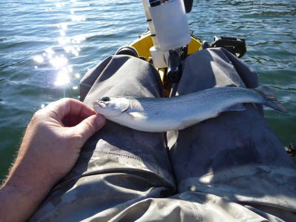 All fish caught toplining. Lake has obviously turned over. Fish rising everywhere all day. I go one spot, kept three eaters and released at least a dozen fish. Mel boated at least 15 fish and kept a limit. Off the water at 3:30.