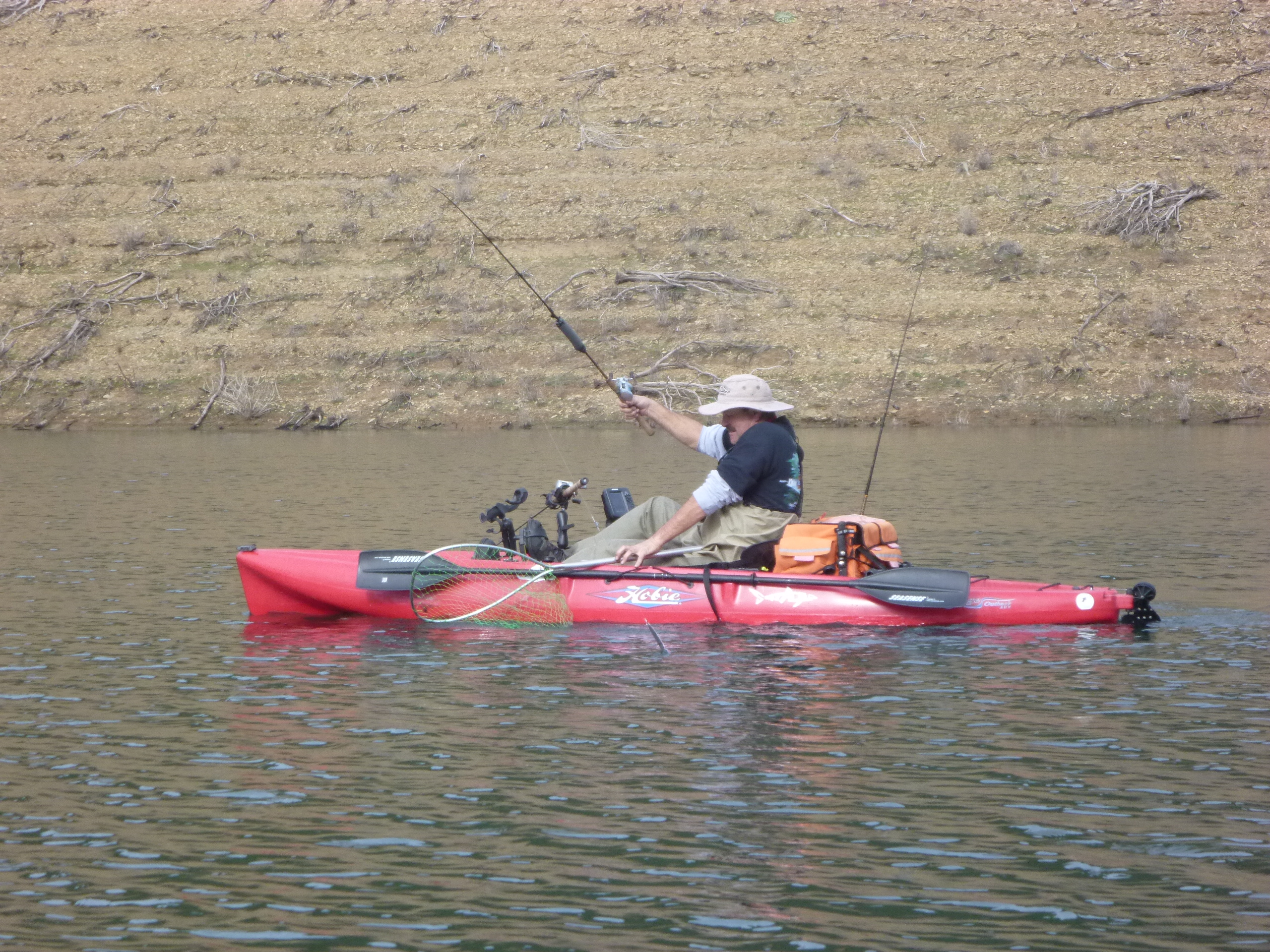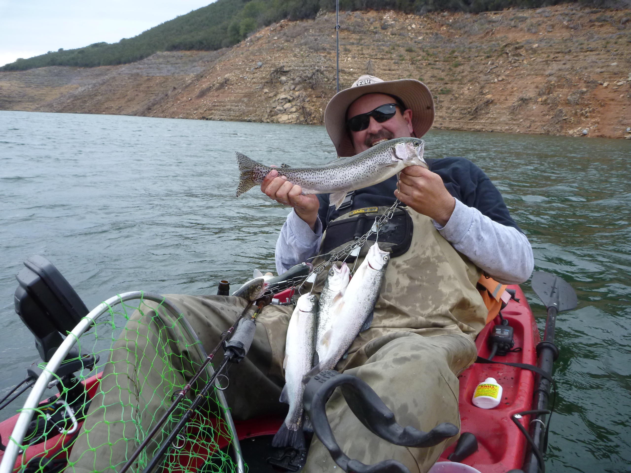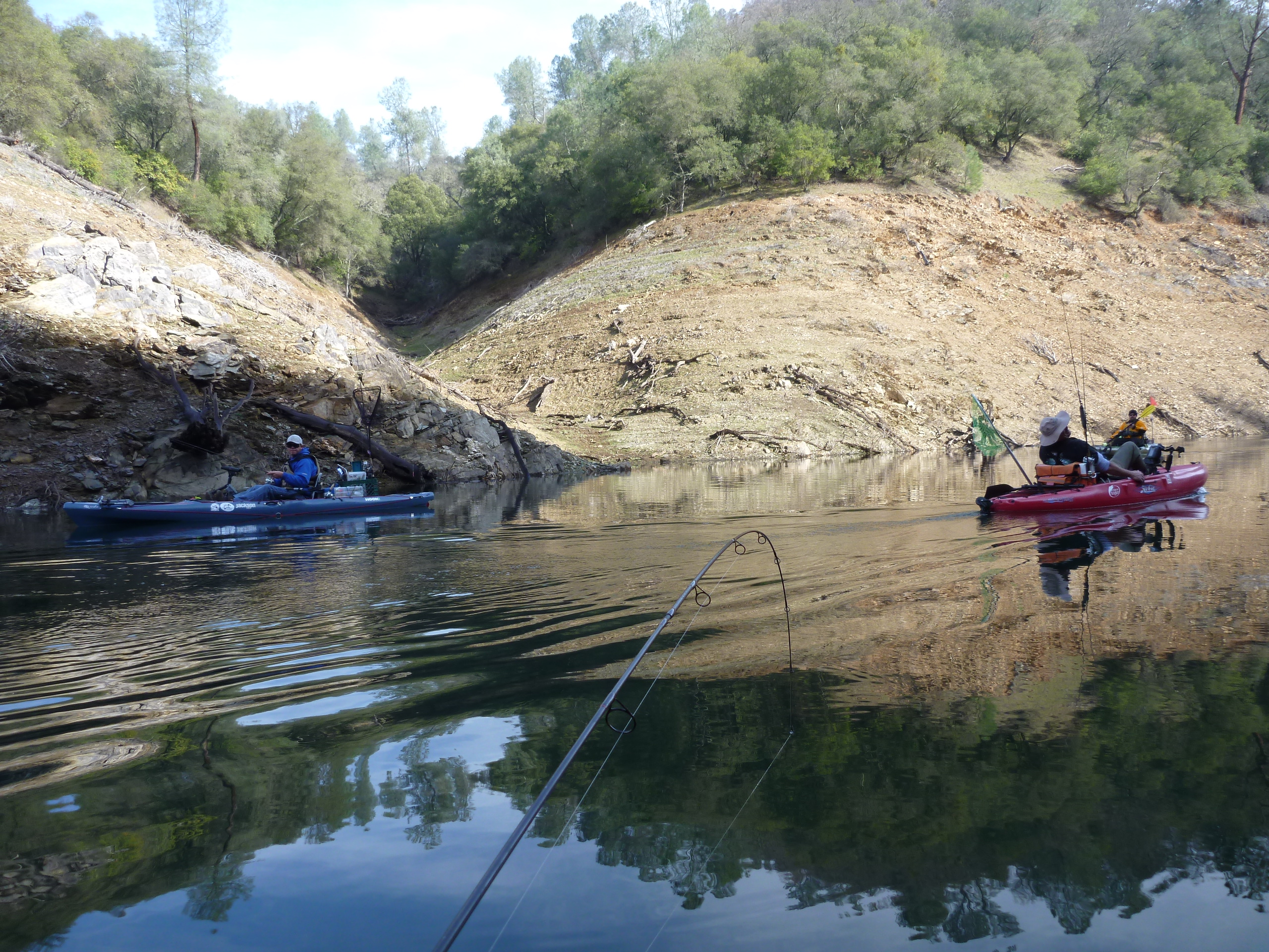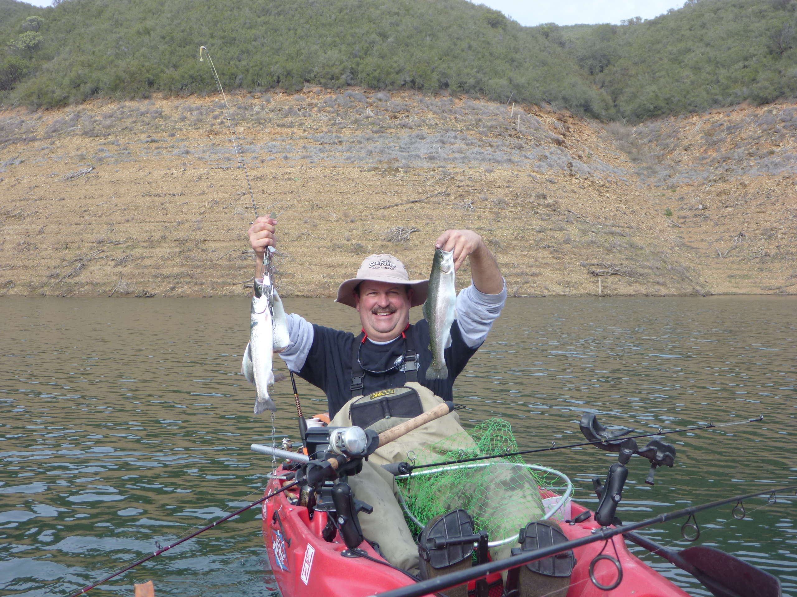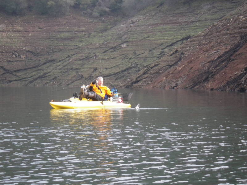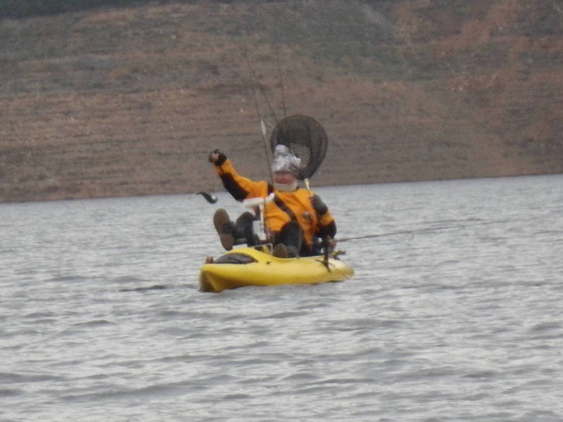 Hit the Tuttletown ramp at a leisurely 9 AM. Saw a couple of NCKA brothers SonoraMIke and Daleshark Tim at the ramp. Stellarman and I ran up the creek without a paddle. Passed Reel Habit Rod and and friend at the environmentally sensitive buoy and they were already sporting near limits. After dallying at the creek mouth we slipped back out to the bouy and commenced to whackin. I got off to a good start but Jerry was en fuego. I landed 4 and he punched 10. Flasher worm worked. Gold kastmaster worked. Rapala worked. Rainbow kastmaster worked. 13 miles pedaled today. Great weather all day with overcast.