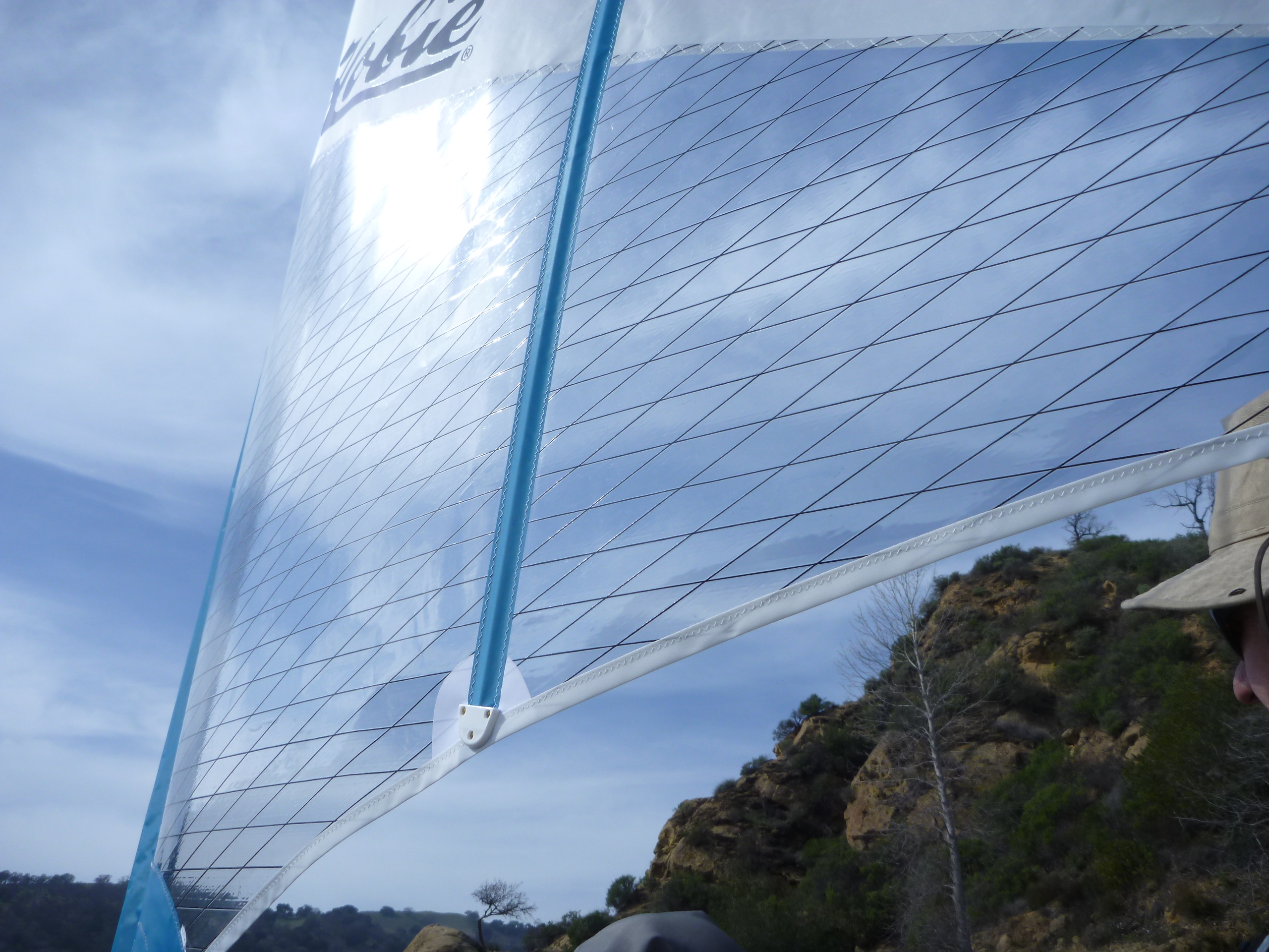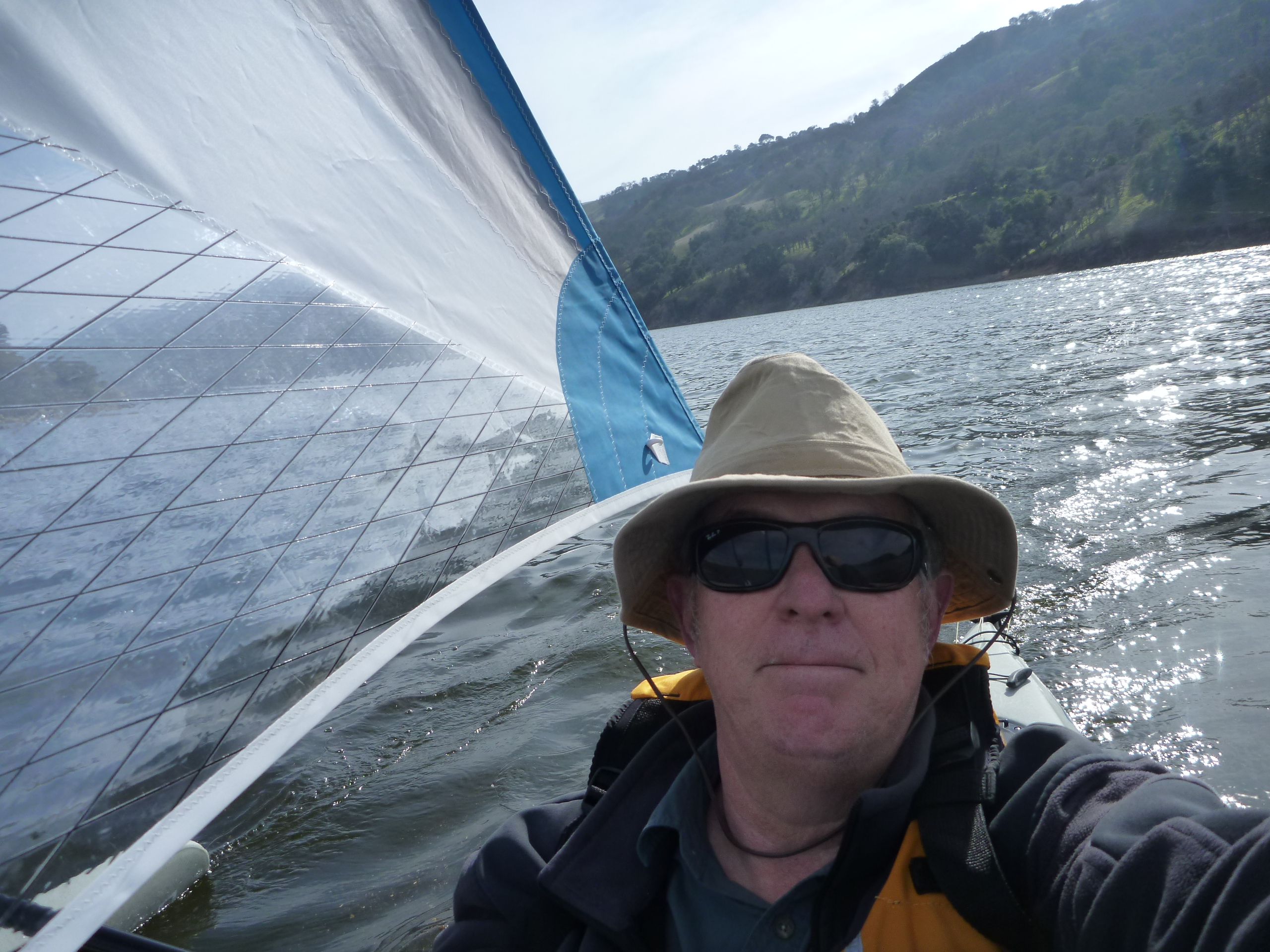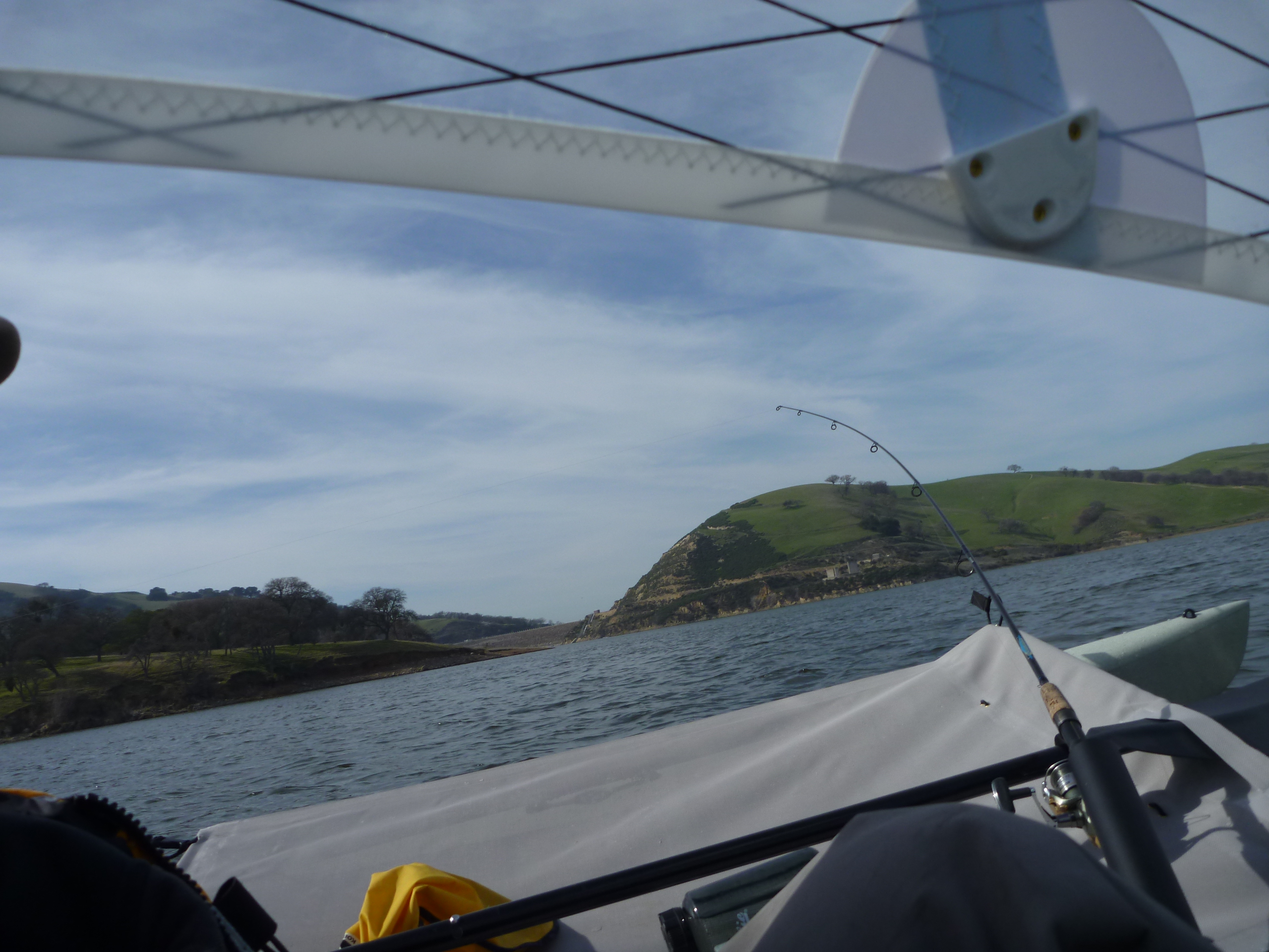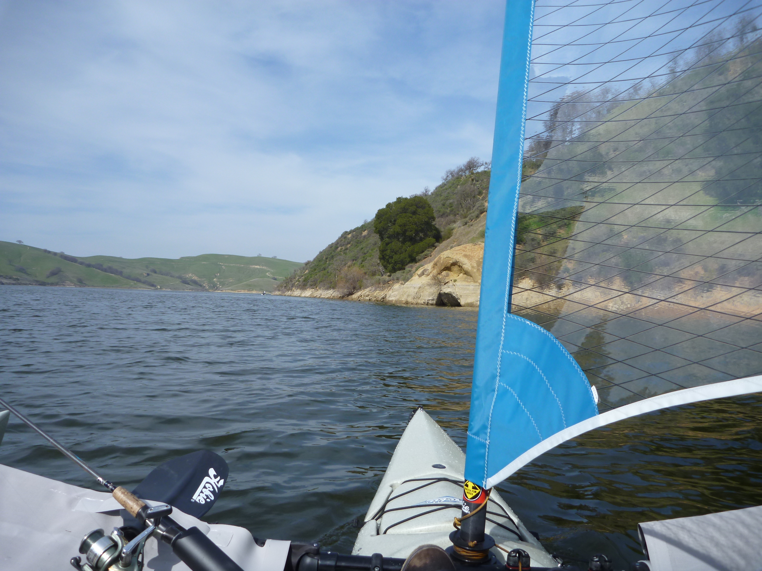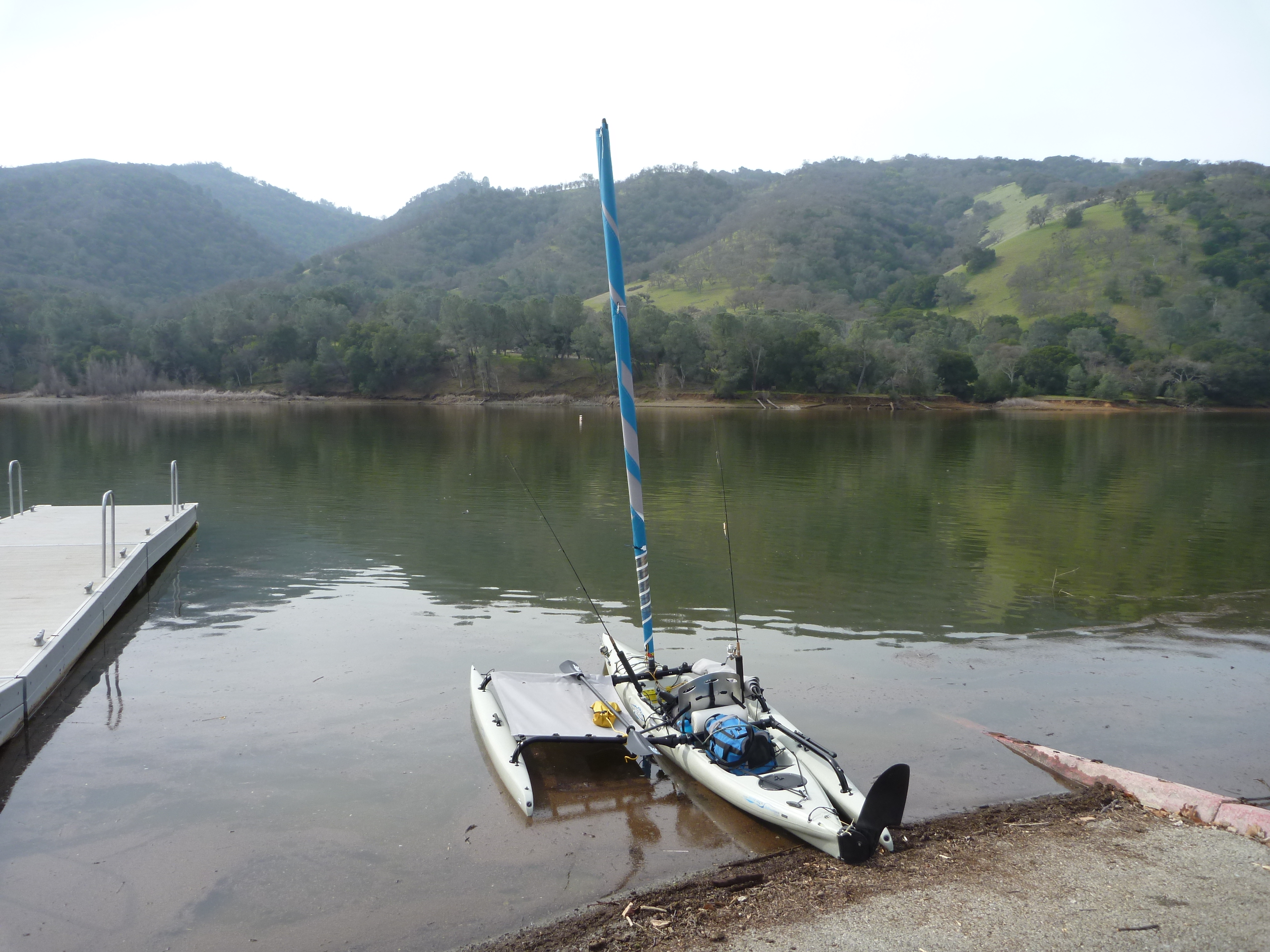 Been preparing my new sailing kayak trimaran since first week of January. My first outing to Berryessa a couple of weeks back did not go well so I hardly thought of that as the maiden voyage. So I got the pass to launch the new beasty at Del Valle. Light winds and good weather were predicted. I brought a couple of rods and setup went much smoother today. Here is a shot of how I launch with one Ama folded in.