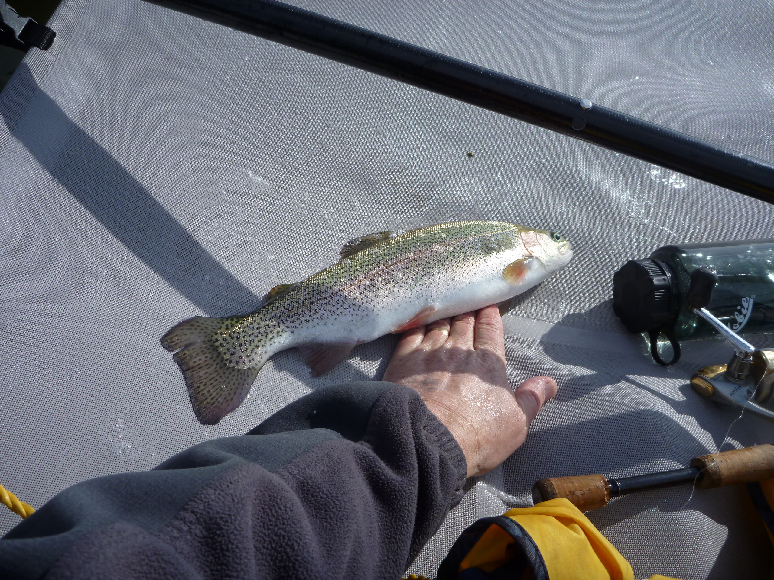 Round the corner on the last big bay east of the dam and get slammed on the shad rap by a decent size trout. Hot fish. Had to furl the sail for the battle. No net but managed to land it.