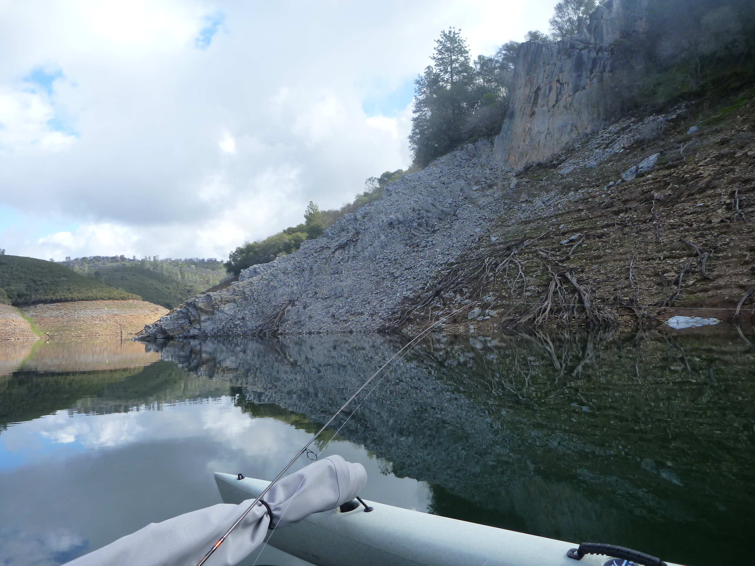 I pedaled back to Mormon Creek hoping to see the grebes stacked up at the “environmentally sensitive area”. Several bald eagles working my holes. Caught one nice camera shy rainbow near this rock pile