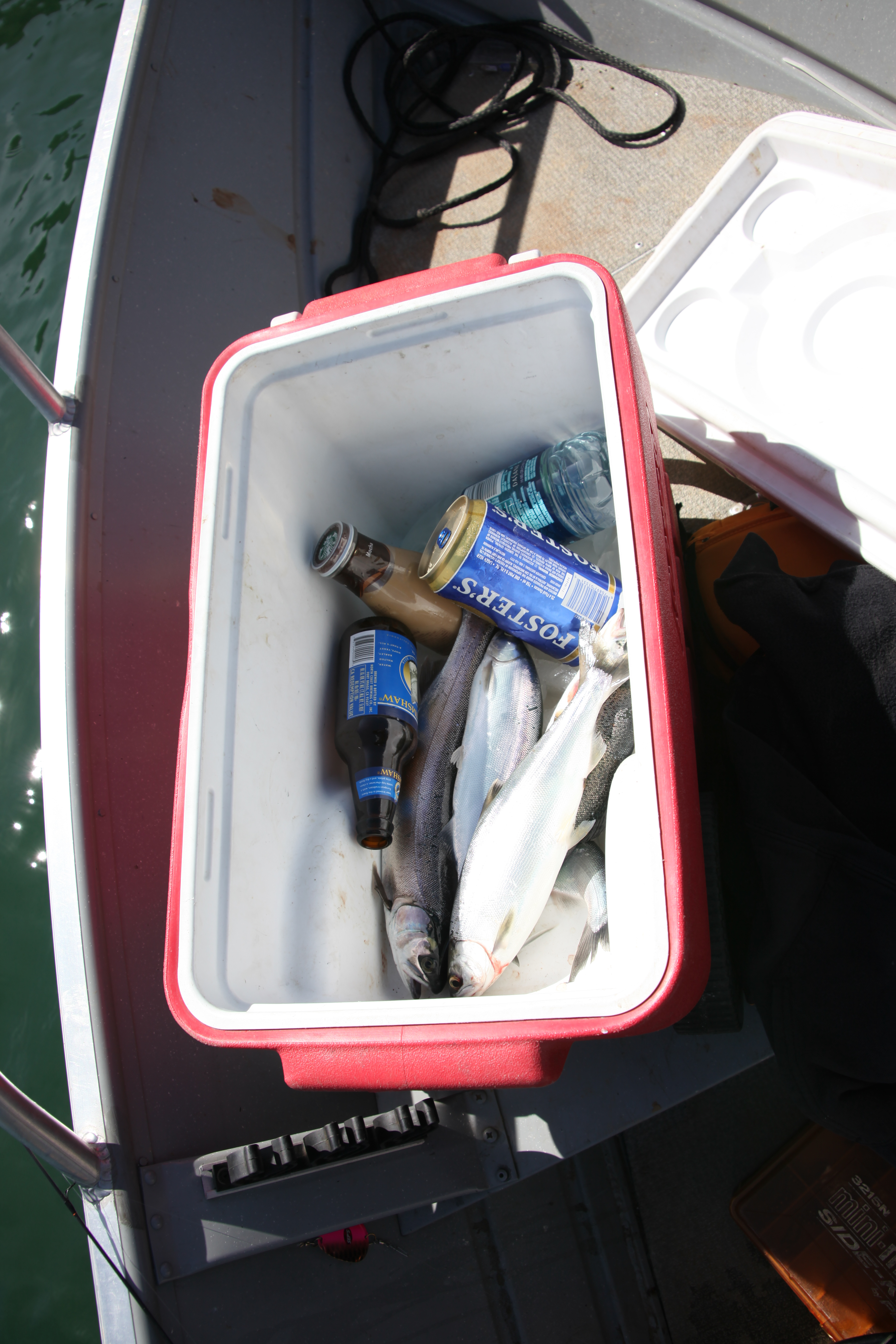 Solo today in the tin can. 8:30 launch from Glorious Hole. Ton of trollers out. Weather stellar. 35 feet OTW was the magic depth except for one suicidal rainbow that hit as I was letting line out. Pink bug behind a Seps sidekick was the ticket. Tried hard for bass but only a few half hearted bites. Need to switch out the downriggers clips as they would not pop it off today. Oh and I need a couple of real whippy rods too.