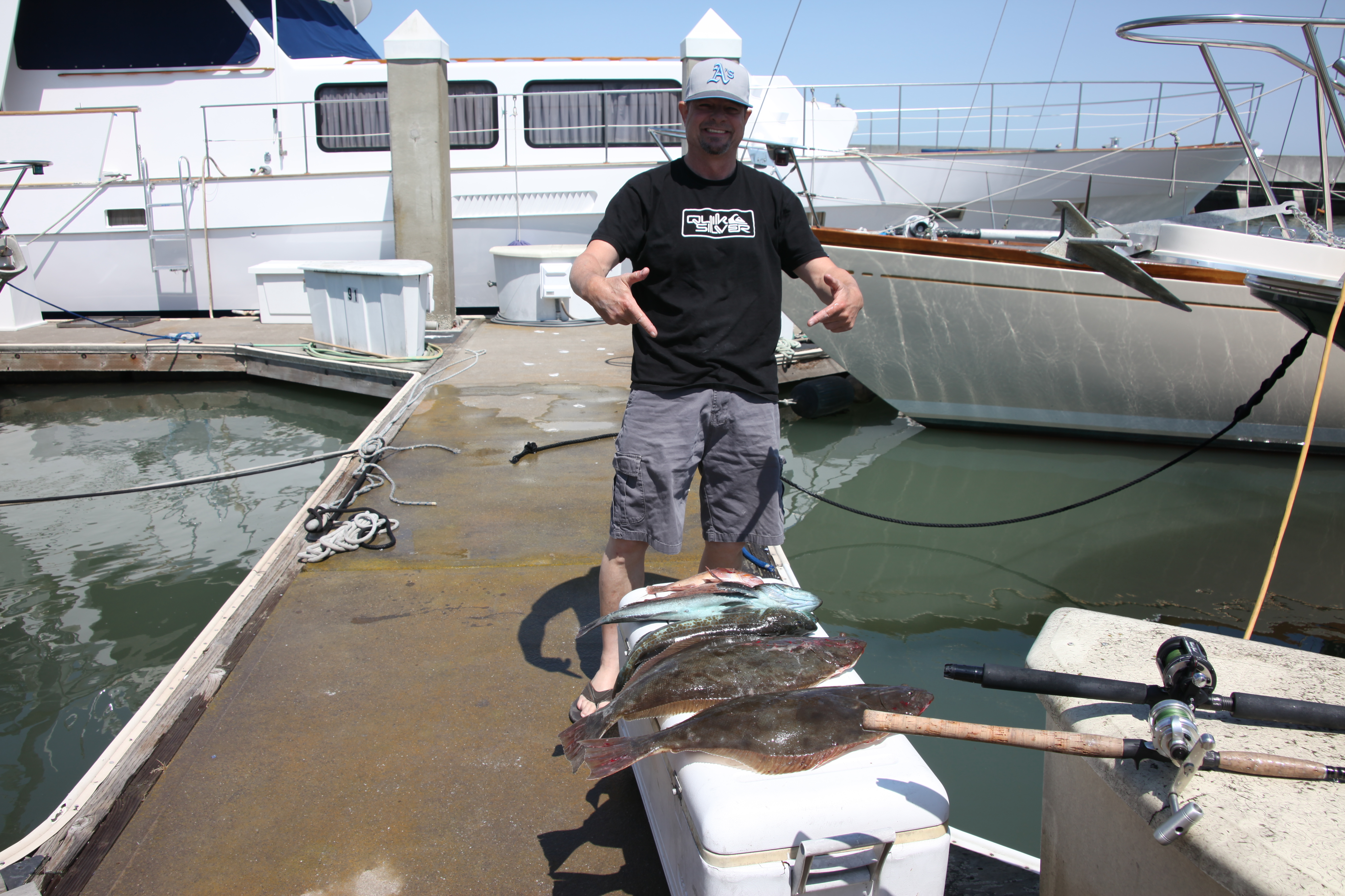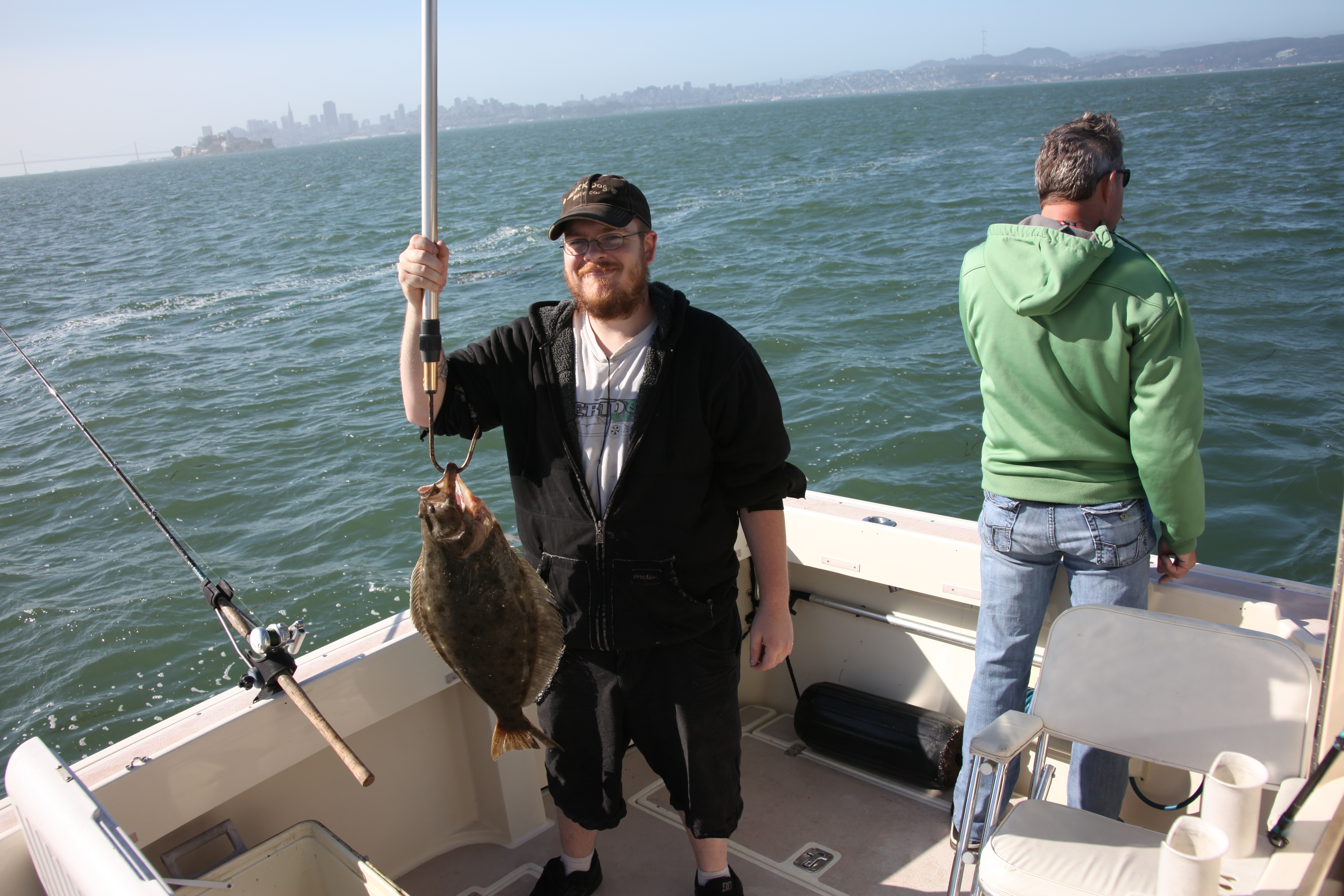 Much different from Pier 39. Great dinner at Anchor and Hope on Minna Street. Crew rolled in at 7:30 AM and we were off to see the bait man. Stopped on the rockpile which had a small fleet of privates but drift was wonky so we continued to Angel where we picked up a hali in 30 ft of water.