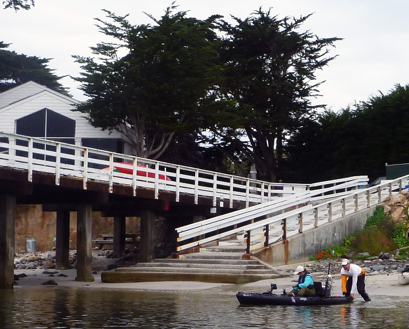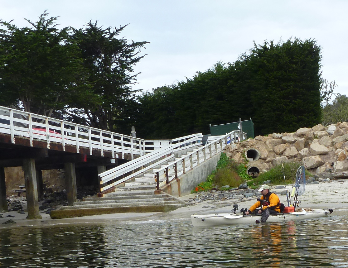 I got an invitation to join fishing legend Bev S. and Kayaking champion Sin Coast to fish Stillwater near Carmel. I don’t have a lot of ocean kayaking experience so I was amped/bugged. Up at 4:30 AM after a fitful night sleep. Stopped for coffee and notice trailer lights nonop but I am on a mission. . On the road at 5 but had to turn around 5 minutes later. Forgot my FF battery and radio. Light fog coming into Monterey and absolutely no wind. P town to Stillwater 1 hr 50 minutes Paid the tithe at 17 mile drive and wound my way through the incredible opulence of Pebble Beach down to the mighty exclusive launch at the Beach Club. Bev and Pat were mostly rigged and we were on the water at 8.