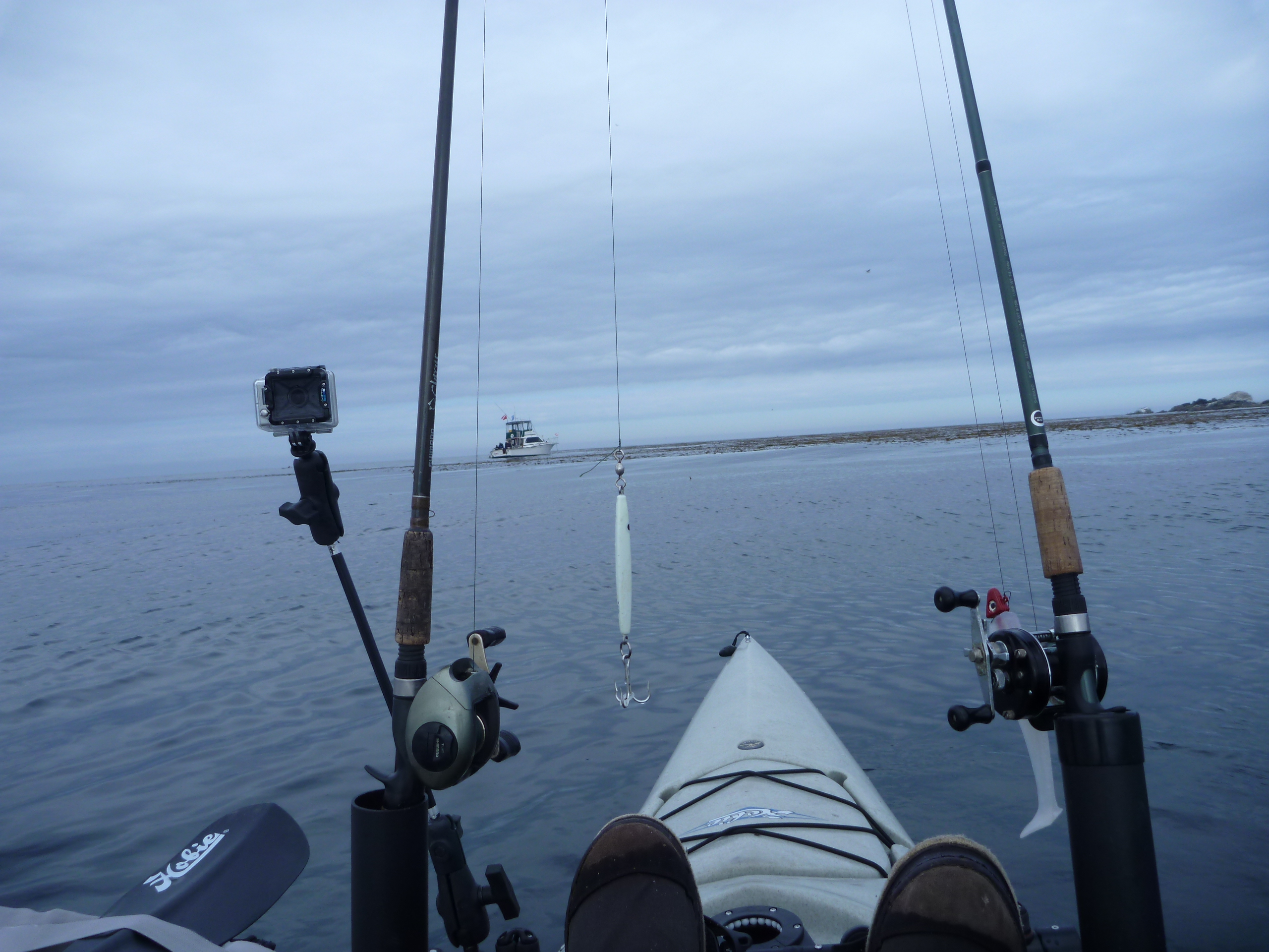 We rounded the corner and and saw some birds and whaleage out about a mile but the guide herded us out to 90 feet of water working the kelp edges. Lots of live around with harbor seals, leapord seals, sea otters, pelicans etc keeping me company. I was doing ok in maybe 3 ft swells every 10 seconds but not entirely comfortable. Drift was moderate and I stayed right on the kelp edge. Huge jellyfish everywhere.The AI with one AMA and tramp was very stable if not particularly agile. I picked away at some bolinas and blacks. Pat and Bev headed out around the point. Lost a Pline jig and tied another on in white and caught a couple more small ones. Heard my compadres on the radio but they could not hear me. Around 11:00 I had had enough with full bladder and feeling very tired.