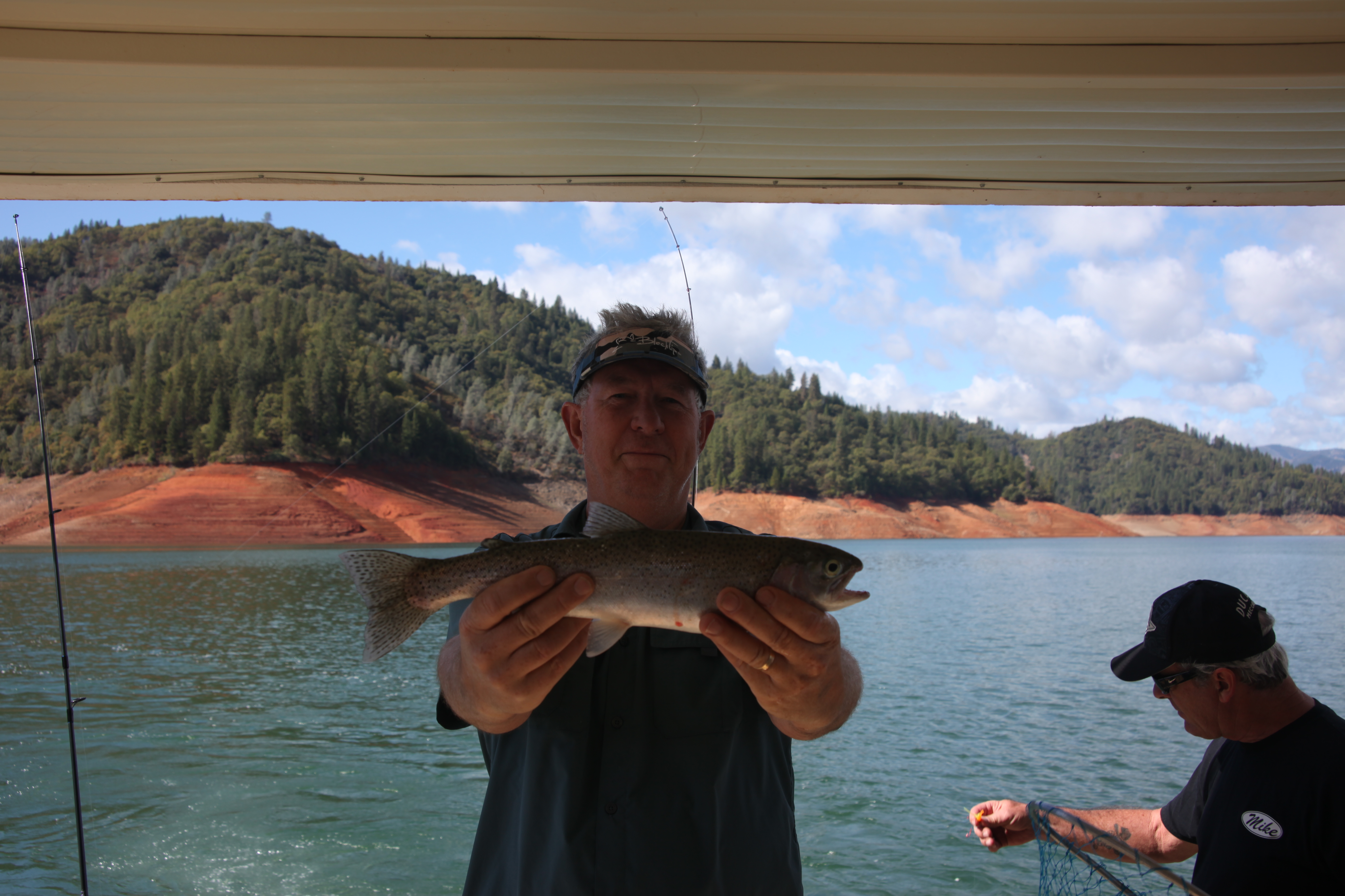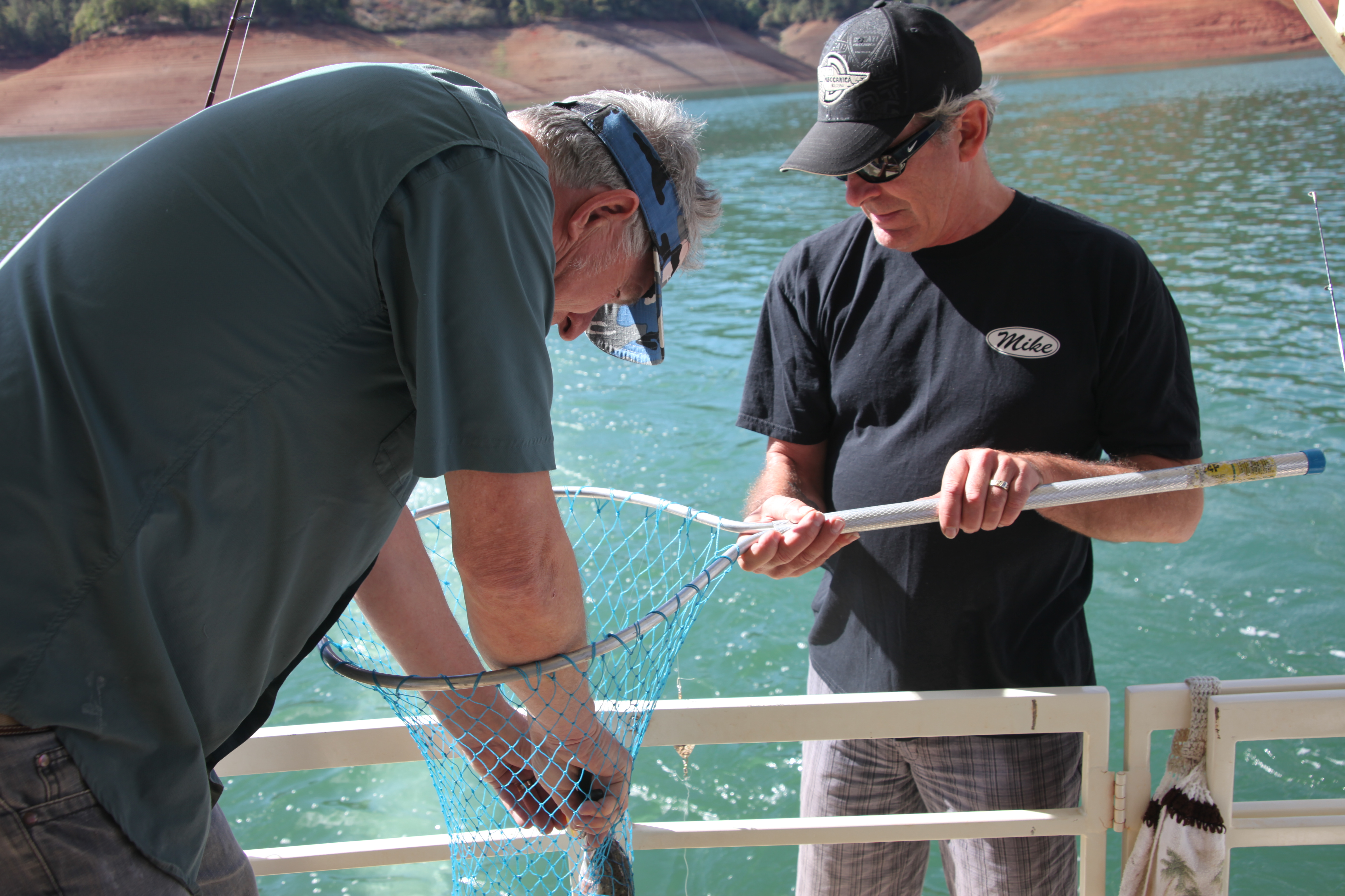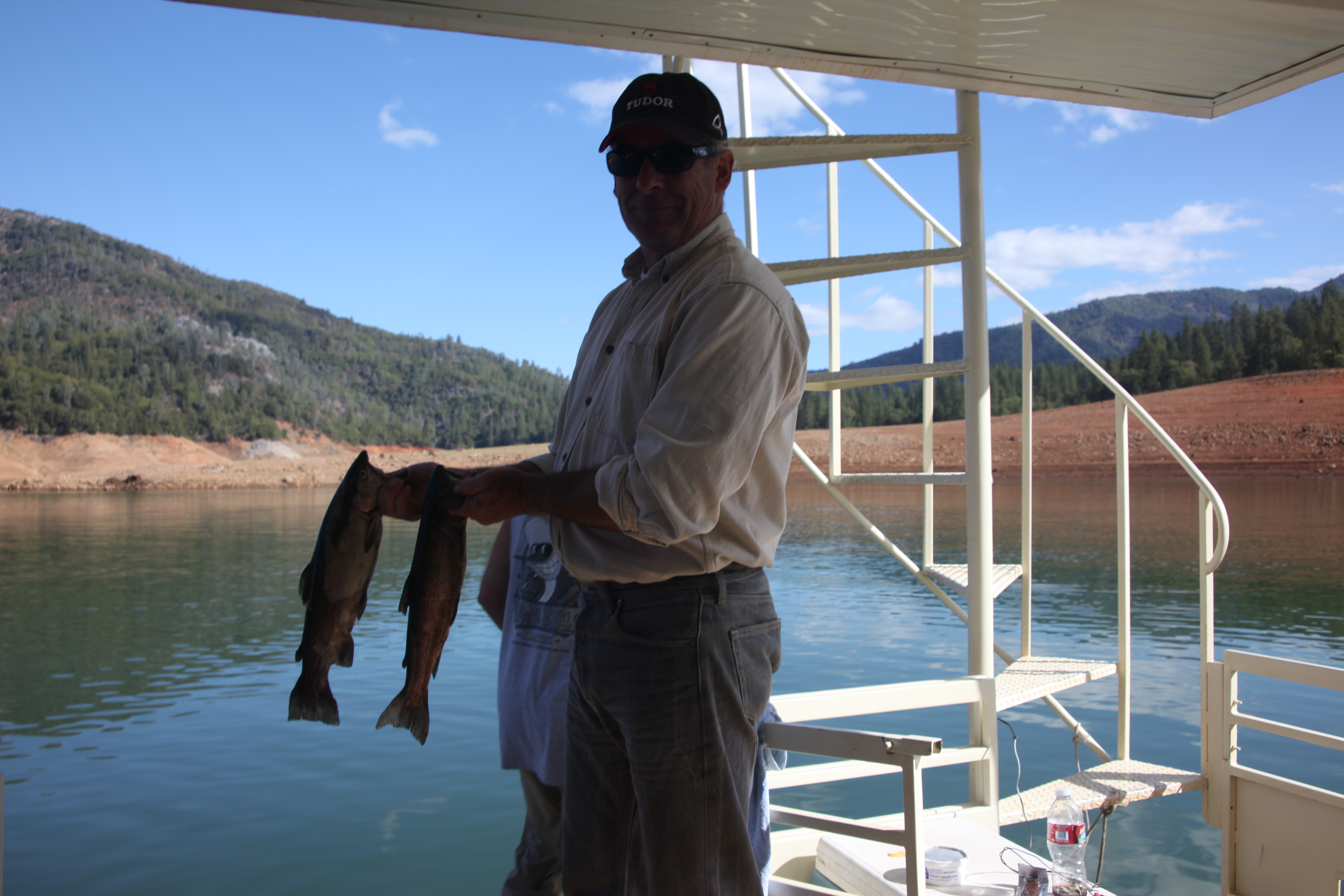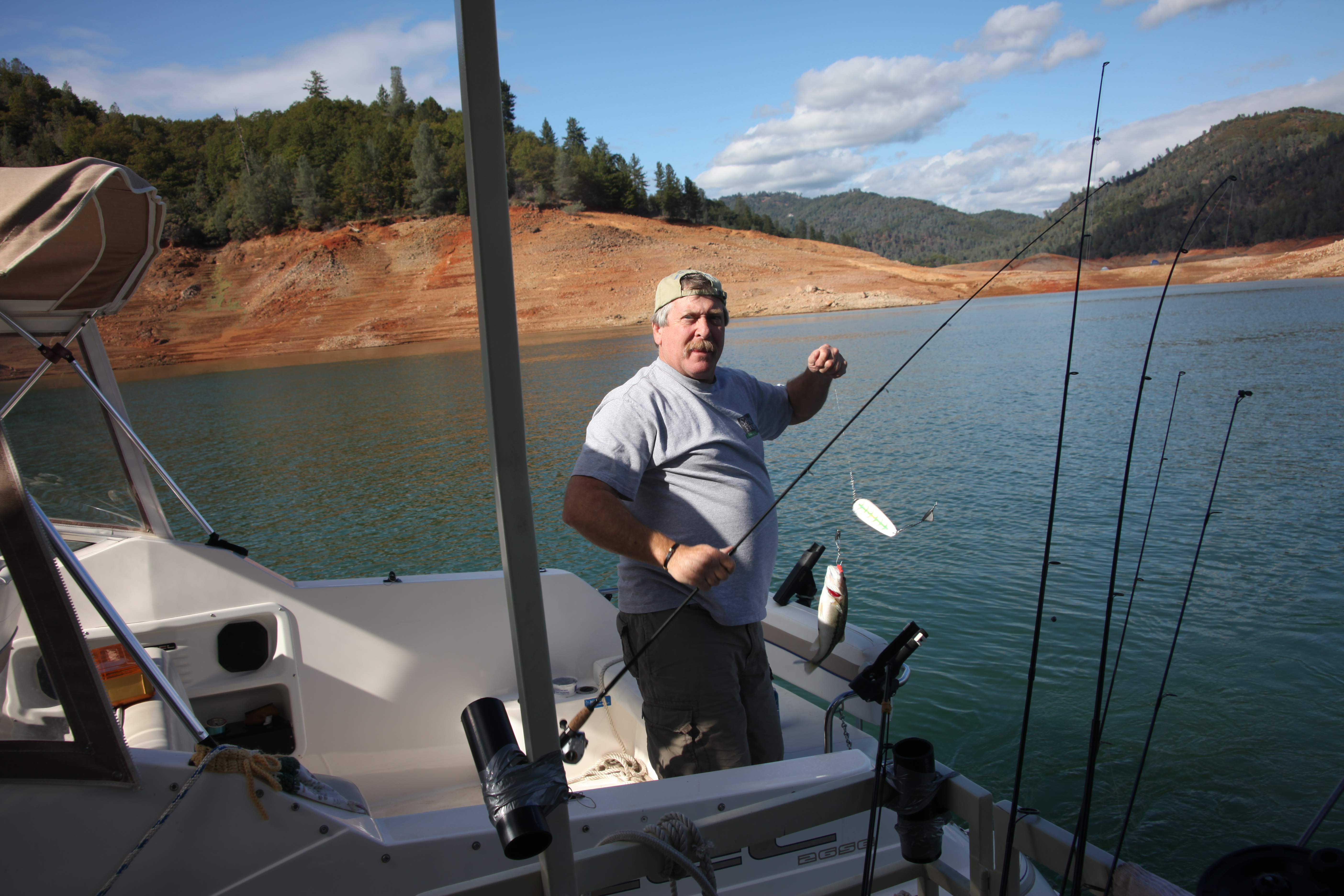 Mel and I with help from all ran lines all day and night. We ran stacked downriggers and various surface runners on the troll, minnows under bobbers, minnows and crawlers on the bottom tied up. At night we ran 2 floating crappie lights and chummed all of the moldy bagels. We found the mother lode where the McCLoud dumps in with bait by the acre and fish going apeshit on top. I tossed blue and silver kastmasters for hours with all the spotted bass I wanted to catch with a few bows mixed in.