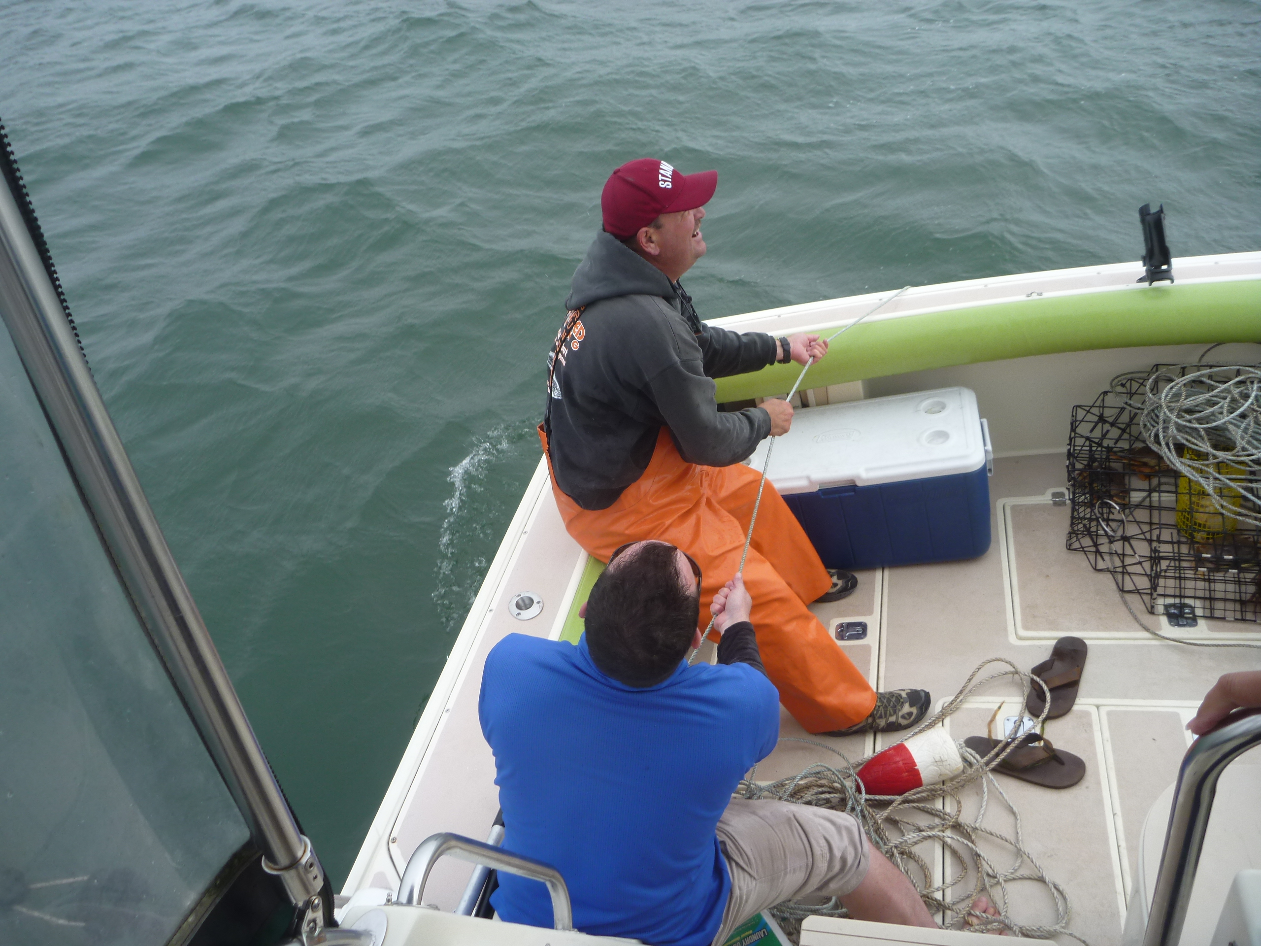 Out the gate around 2 or so to the shallow pots. They were right on the marks. It was rocking and rolling pretty good but we got both pots located and they yielded a couple. These two guys kicked ass on the manual labor stuff whilst I guided us through 6 ft rollers with an occasional 8 thrown in.