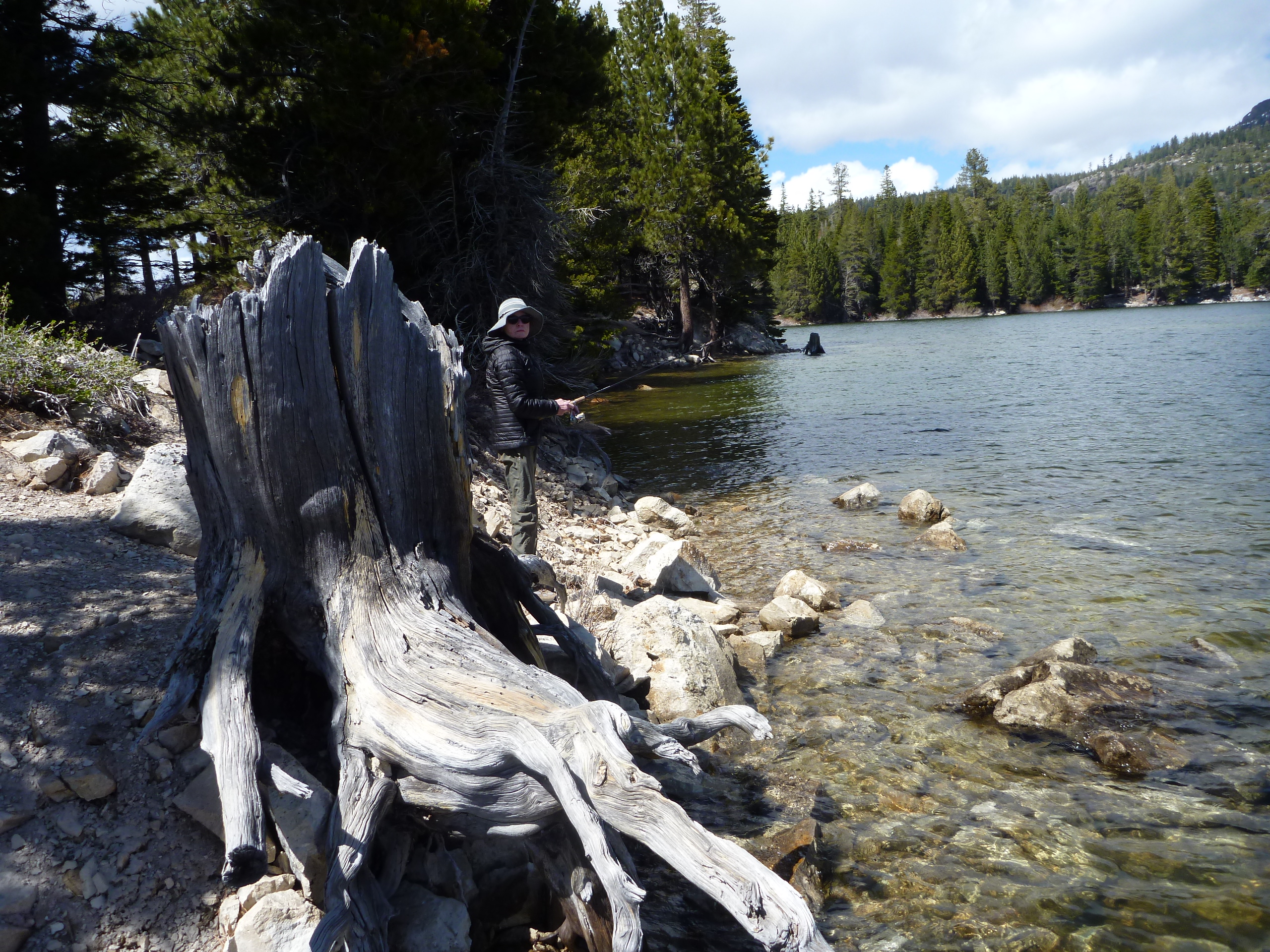 We threw junk for an hour and then pushed onto  Caples where we found a bit of ice still in place and more wind. We found a little lee near the corner of the dam and Debra read in the car while I flailed the water.