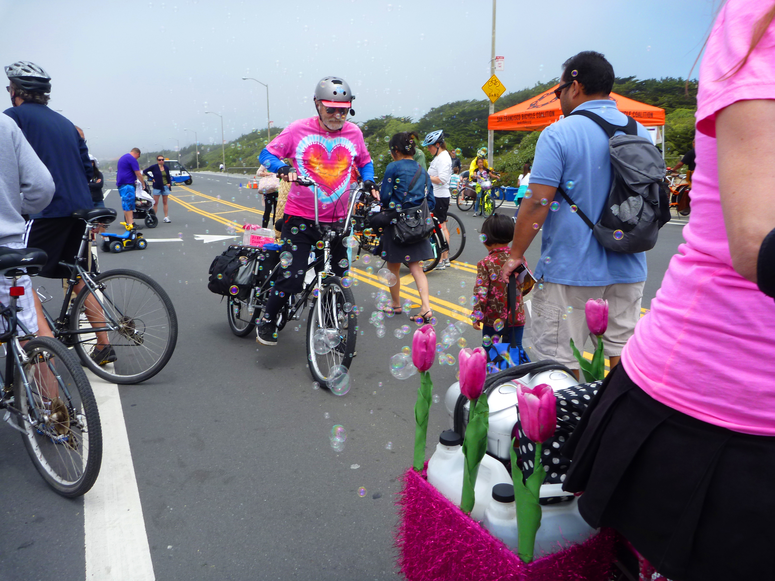 Lunch and drinks at the Beach Chalet on the Great Highway. Then it was time to pedal back uphill. Light turnout overall as far as Sunday Streets goes but the bubble lady made it. Her faithful bubble man in tow forever intoxicated by her bubble trail.