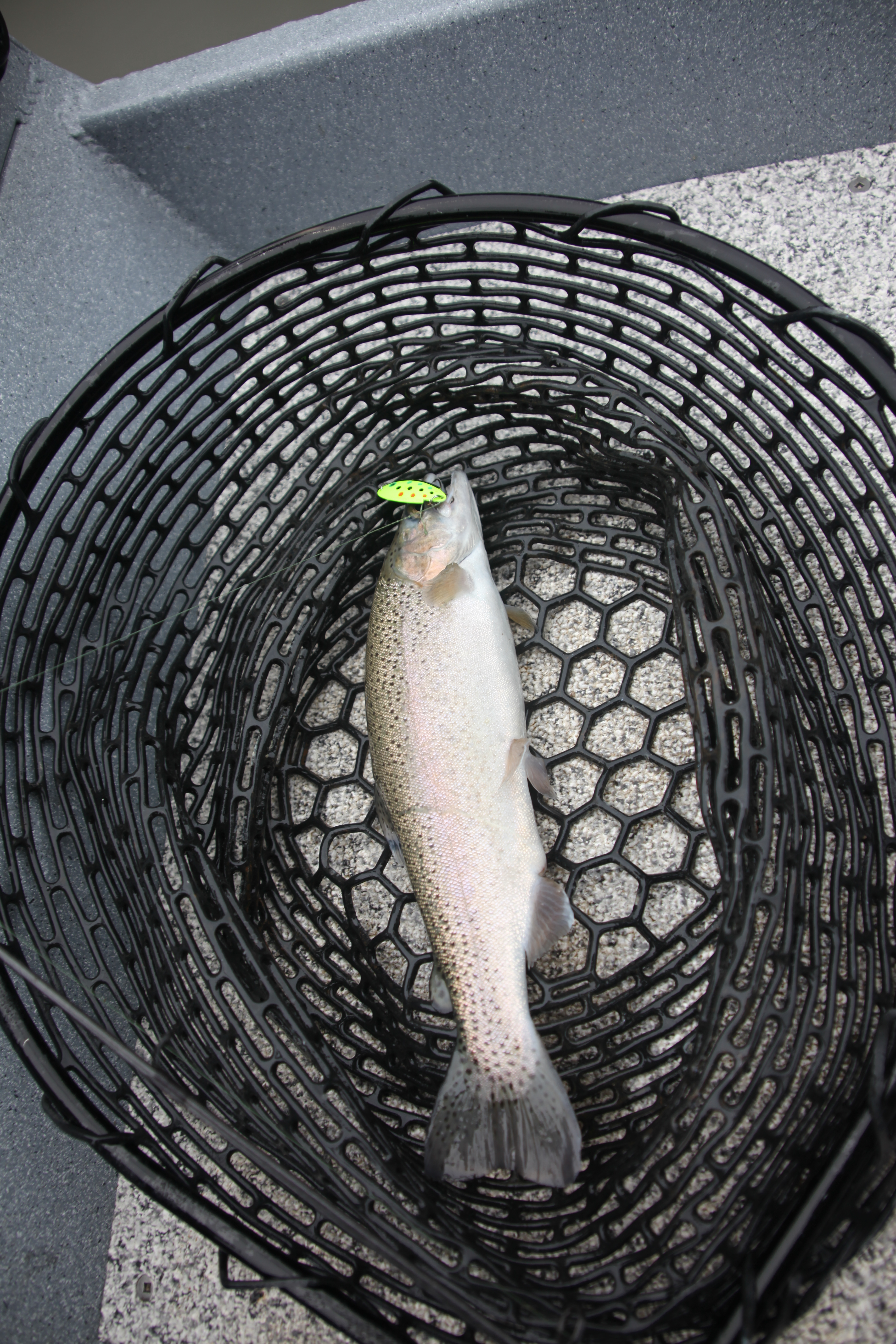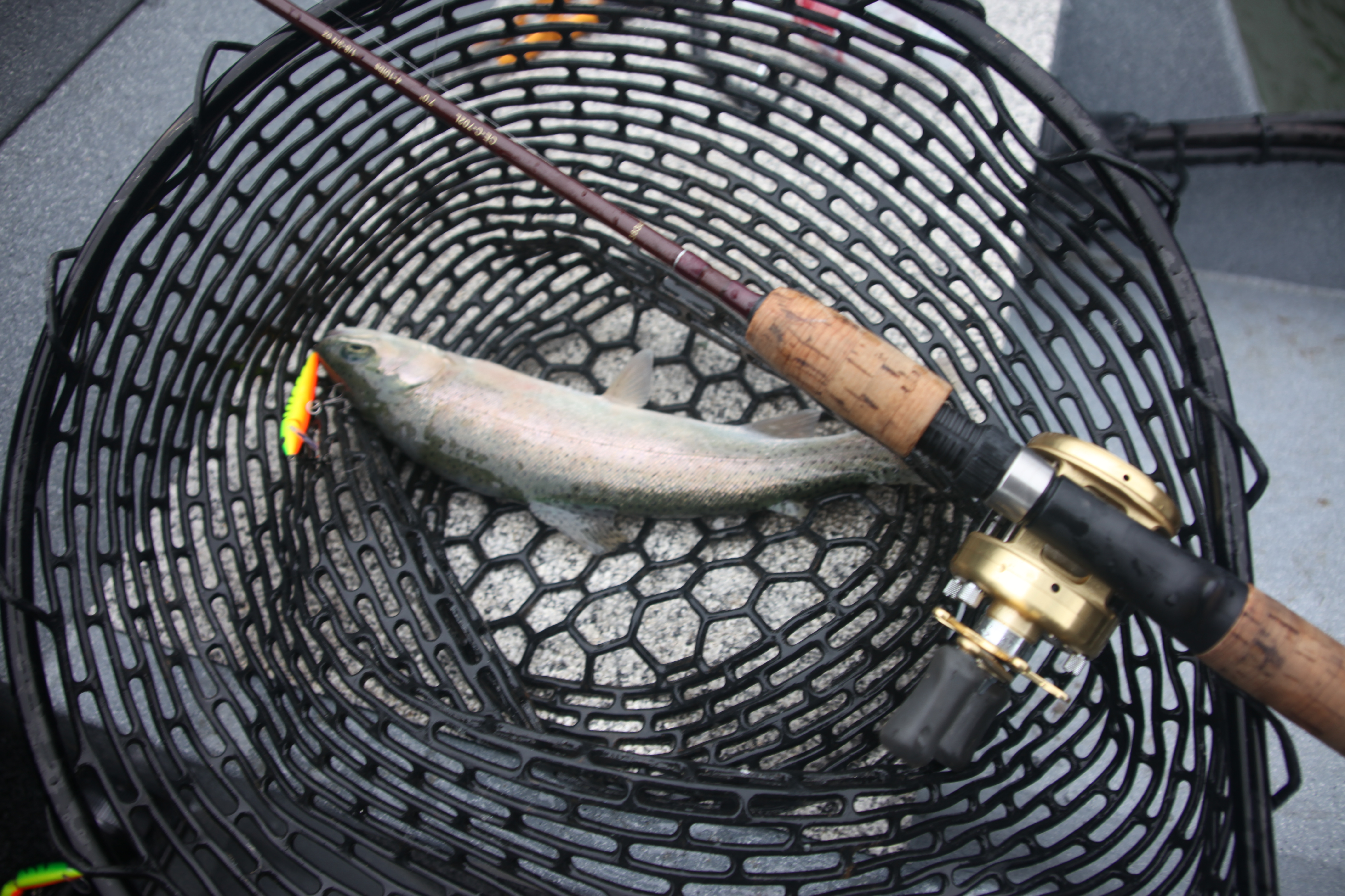 I was able to launch from the concrete ramp finally. I motored directly back to the Coyote arm. When I was there a couple of days ago the inlet was clogged with bass boats so I got there early enough to have my pick of spots. I hit spot lock on the Terranova and began casting a Fluorescent green Tomas Bouyant and first cast get nailed on the flutter.
