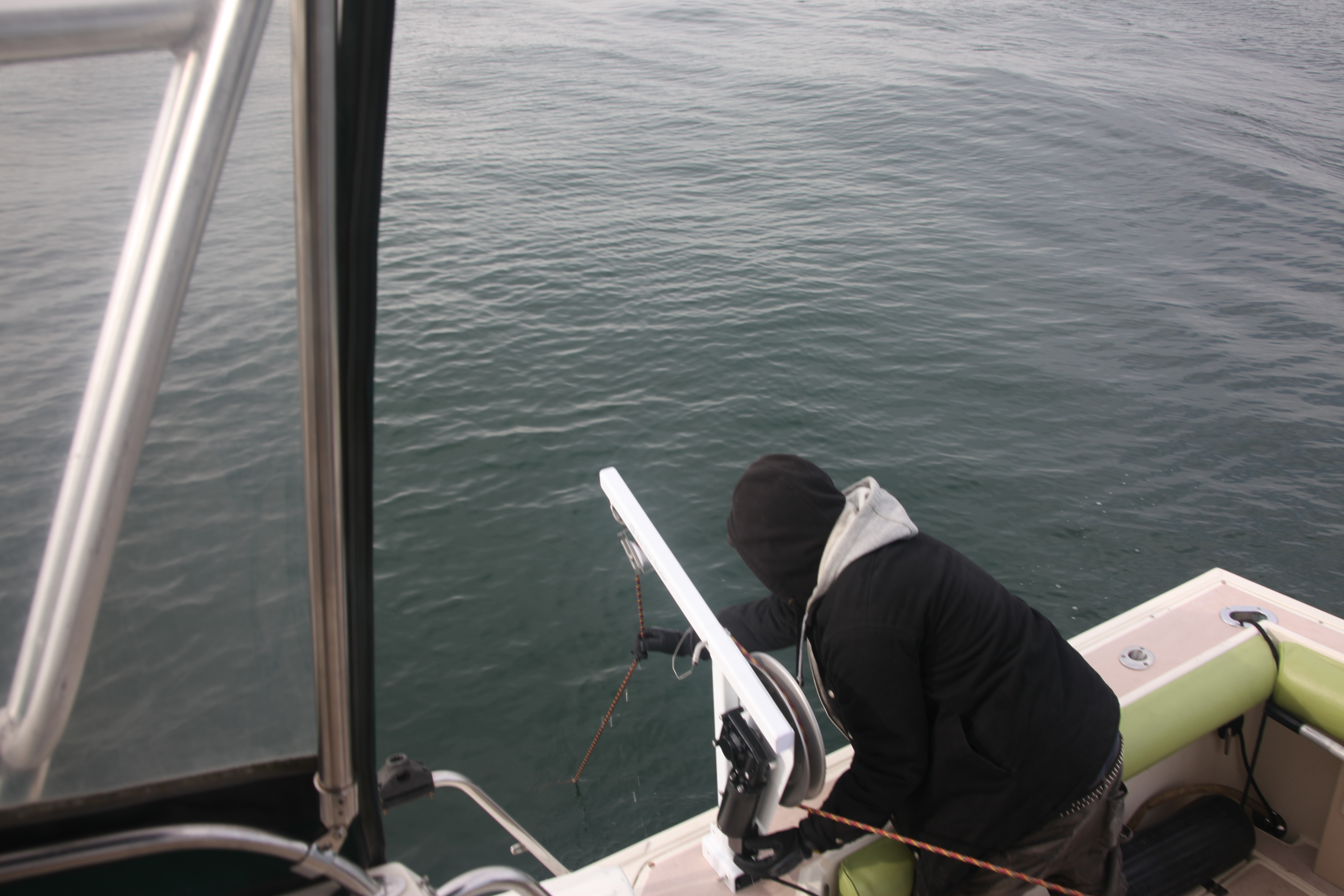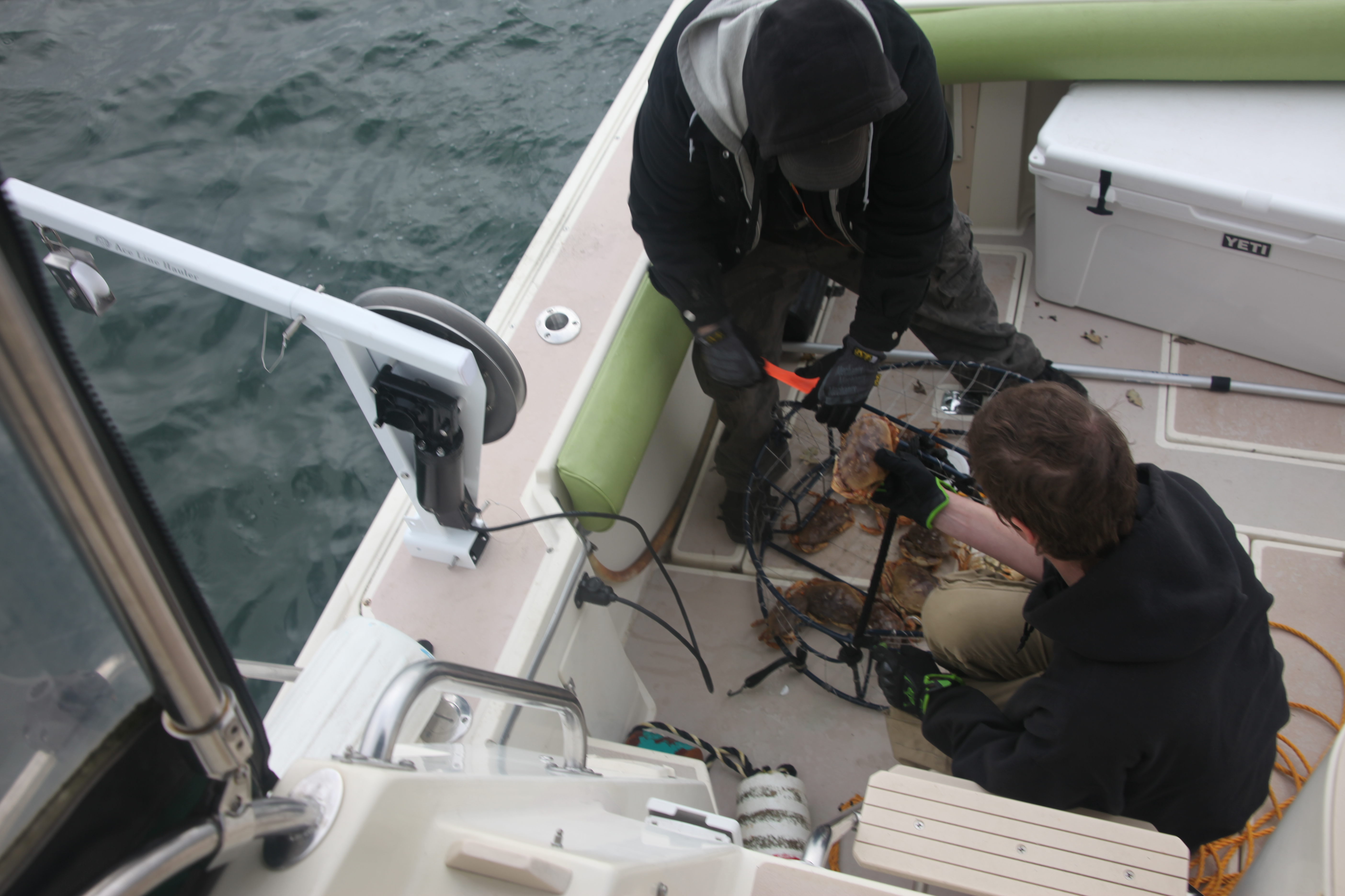 Still learning this crabbing thing. We set 3 pots baited with Squid, herring and anchovies in 65 feet of water off Slide Ranch. Killed some time sightseeing Rocky Pt. area and twiddled our thumbs for an hour. Ocean was so quiet we just cut the motor and drifted. First pull on the new puller!