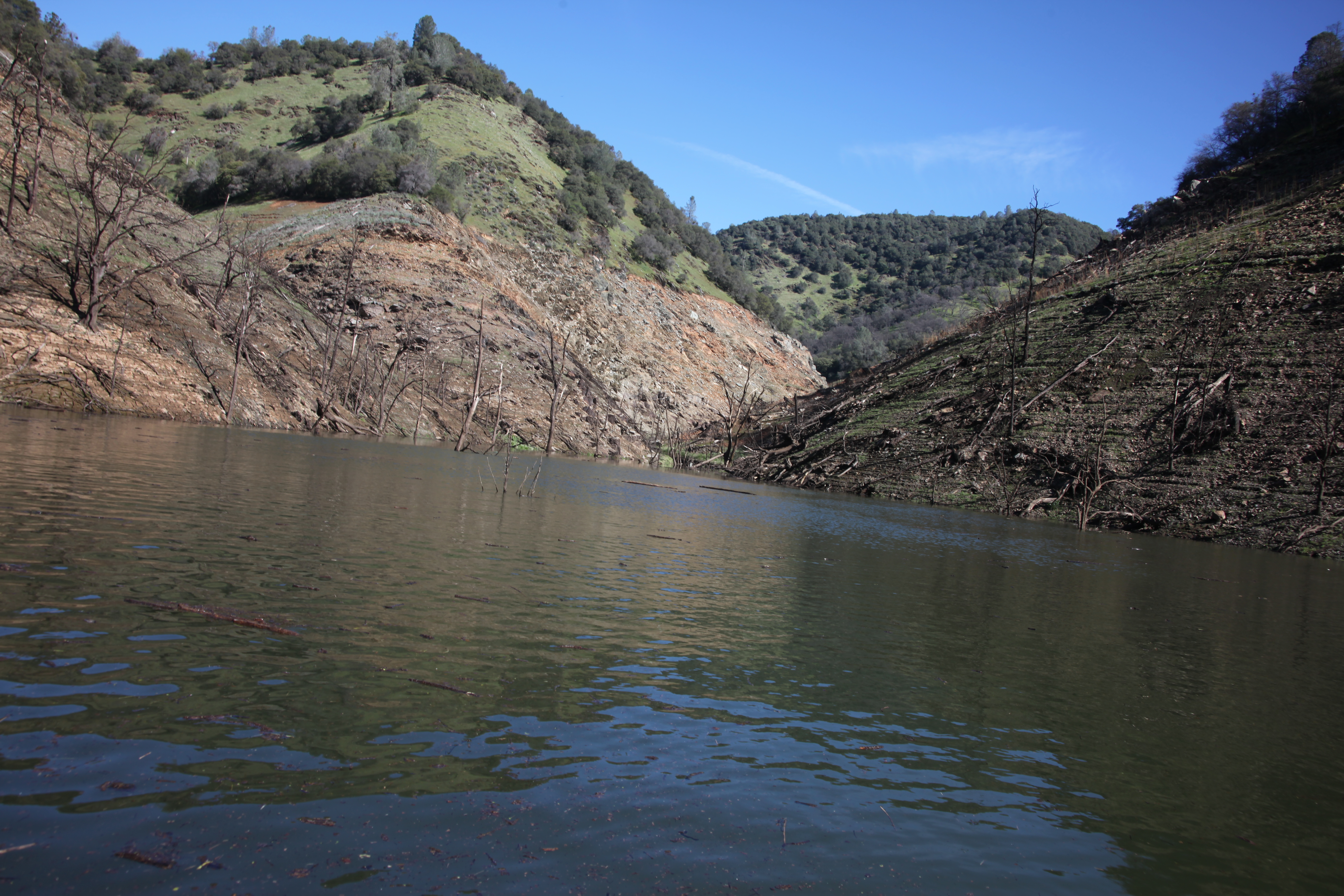 My son joined me for Presidents Day trout fishing. We launched off the dirt at Glory Hole rather than wait behind the 6 guys lined up at the concrete ramp. 70 degrees, light wind no clouds to hide behind. Lake was up 25 feet from when I last went.  I motored directly to Coyote to find stained water.