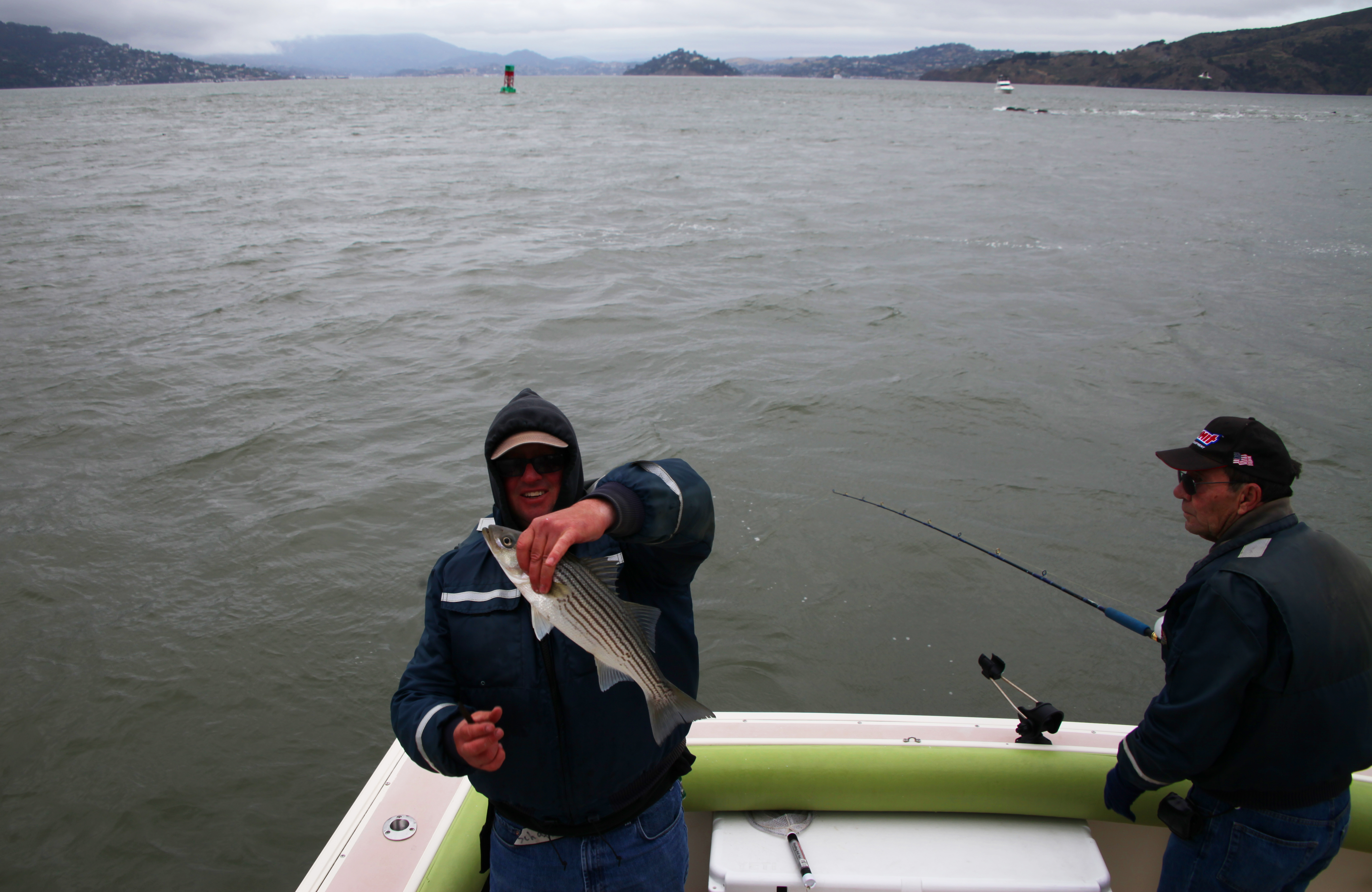 Sunday we were boarded by Mike and his Pops Larry. I was really focused on getting Larry into some fish. We got a great half scoop of anchovies but intel was not that great from the baitman. Mumbled something about Treasure Island and wind. We started there for an hour plus with a crowd but few nets. As the incoming picked up we joined the fleet on the various rockpiles. We fished them all several times. The tight drift in front of Alcatraz was fun for the captain. If you have never done this drift click on the next 2 pics. I stayed on the bridge for this part LOL.