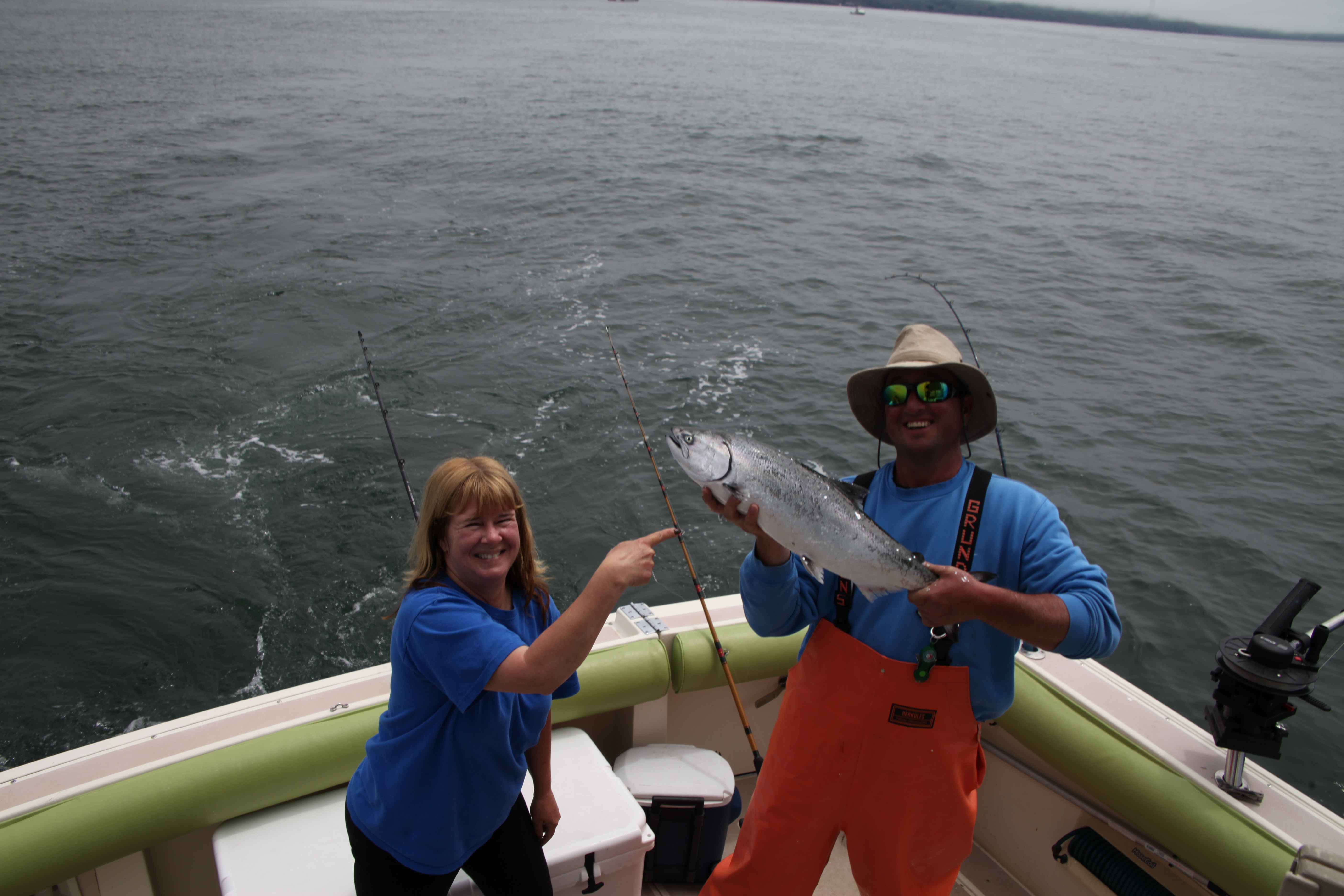 I really wanted to get Larry on a salmon as hit batting record on the Peridot is ZIP. Not due to not trying though. We motored out the gate and up the line to find the fleet stretched from inside at Stinson to the green can. Mike rehabbed my Stellmanized downrigger enroute and I had bought 2 15 lb weights so we were good to go. We had 3-5 rods out all freeking day some on cannonballs, some on pink ladys and some on the wire.. The crew ran the gear frequently with all manner of enticements. Bait was EVERYWHERE top to bottom with frequent breezing. Bev rigged a spoon up on the bow rod holder just case the blacks started busting. We had a few drivebys with one keeper to show for our trouble. Threw a ling, blue and trout back along with a trash bag. Shirtsleeve weather all day.