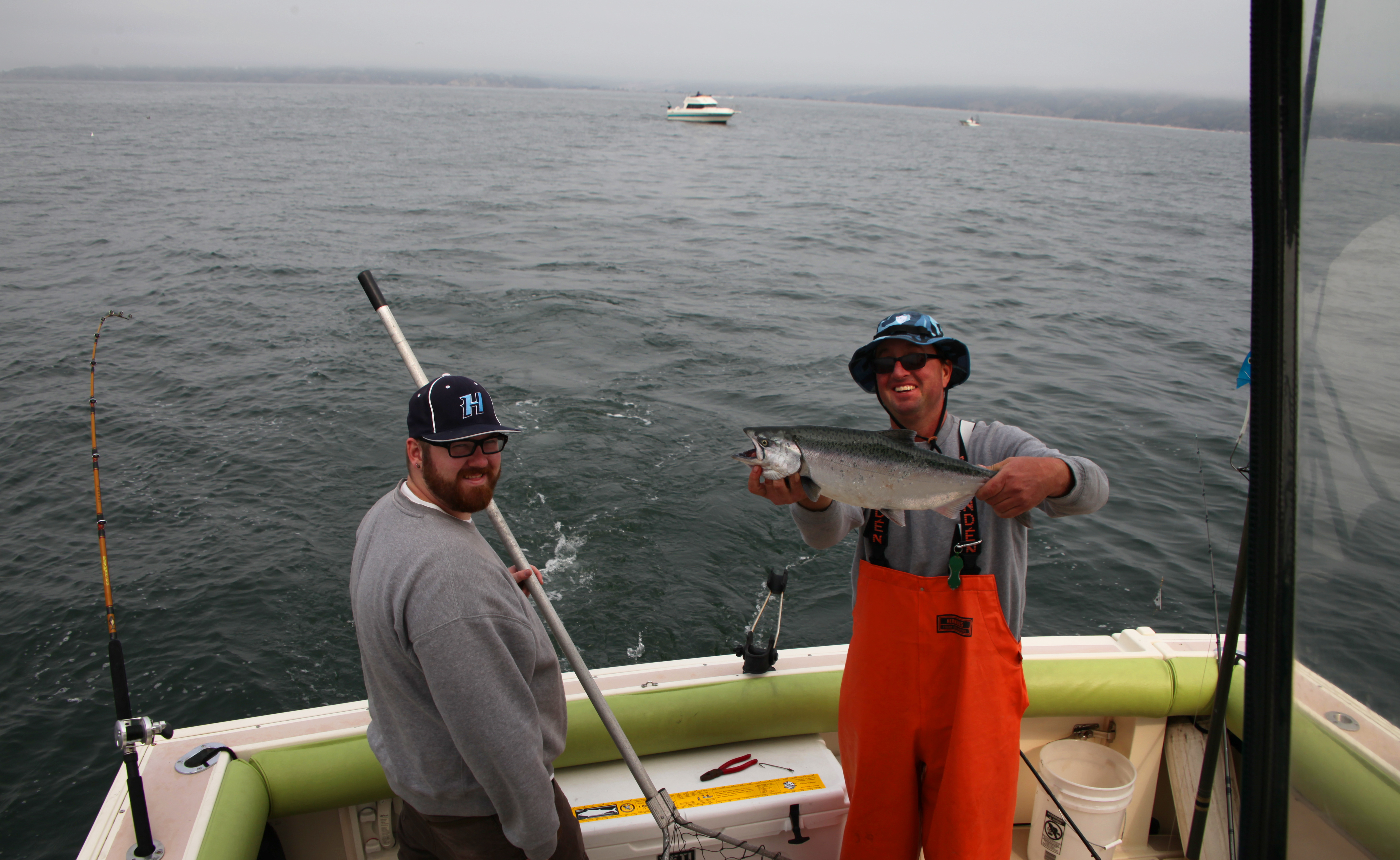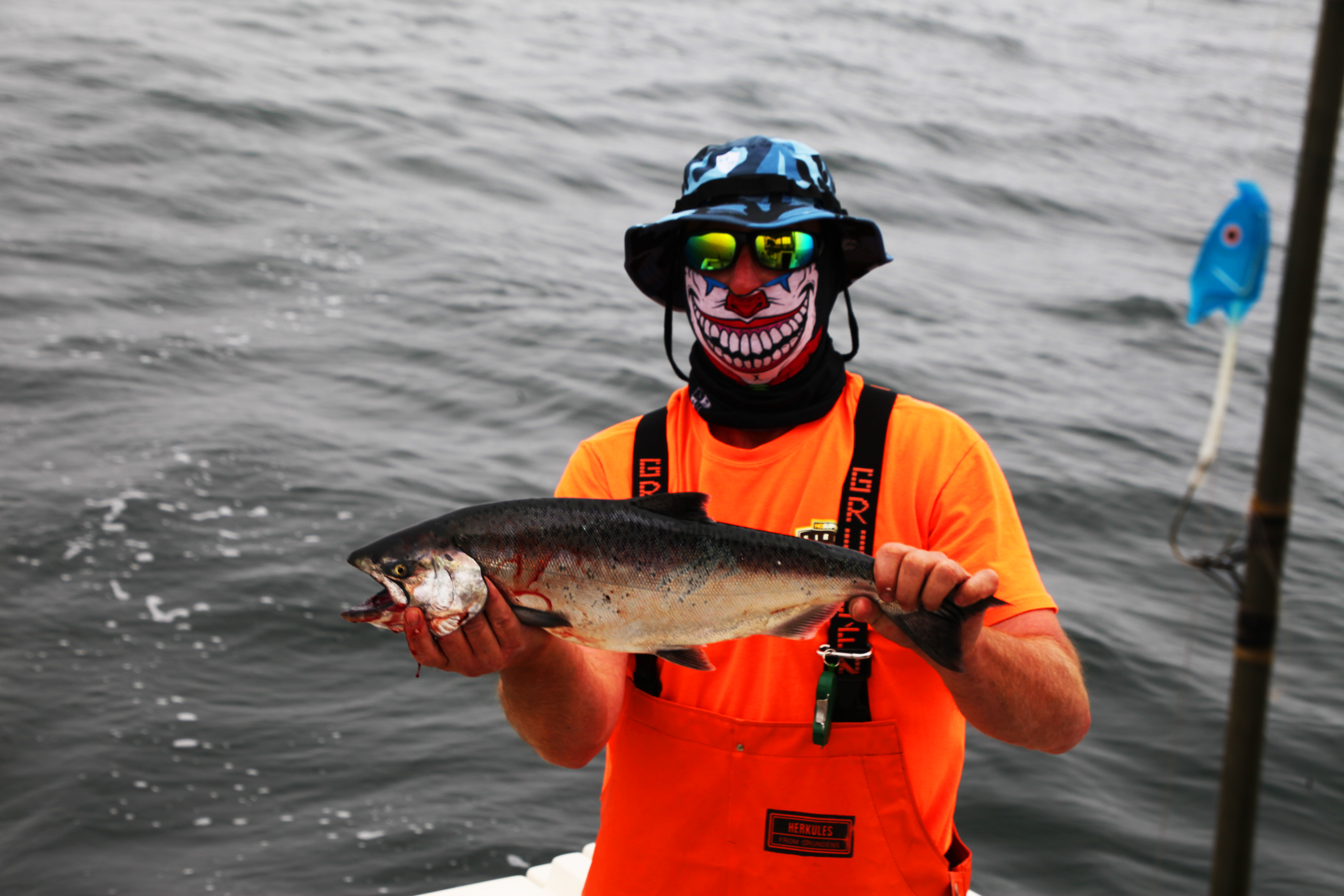 Mike has the deck well covered with 2 lines on the riggers, one diver and a 2# ball on a dog whistle on the 4th rod. All manner of tray bait, WM Apex, etc. We picked up a trout early that was quickly bled and boxed.