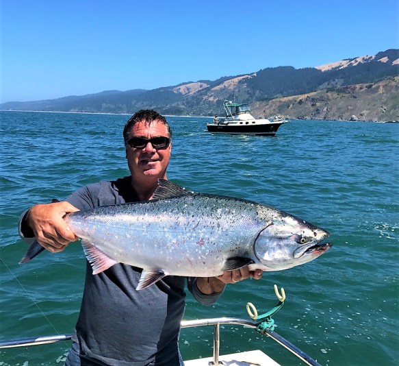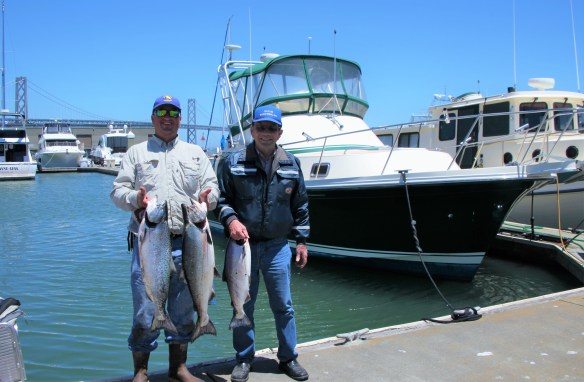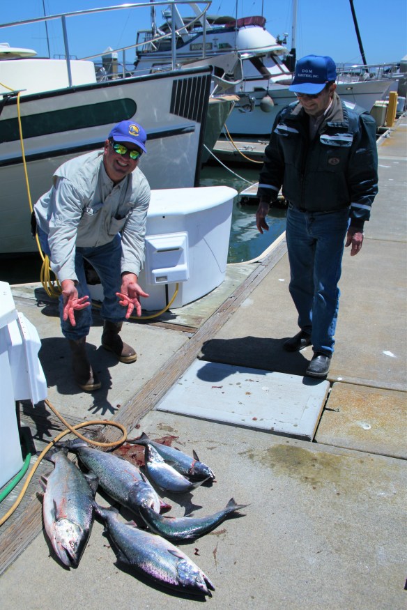 Mr Schaeffer and Mr Schaeffer joined me for a jaunt out the gate and up the line. We did well pulling up to the dock at 1 PM with limits for 3. Two were close to 15#’s. Farmed a few and shook a couple shakers. We fished straight bait on the wire 35 ft down in 58 feet of water. StinsonBeach-Rocky Point and like that. Watched Pacific Ryder with Crash and Fwapper as crew bag a hog as we were trying to transfer unused bait to them. Whale show as well. Nice day on the briny.