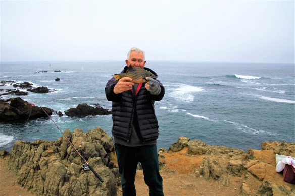 We camped at Caspar Beach near Mendo this weekend. The fall colors in the vineyards of the Anderson Valley were pretty amazing. It was foggy the whole stay but not too cold. Caspar RV park was functional with a great location steps from the beach. The locals at the Rite Aid in Ft Bragg gave me some local intel about some newly open shore fishing spots behind the old mill. They advised not to waste time at the Noyo Harbor jetty. They were right. It was a kick reeling in 2 LB striped surfperch 50 ft up the cliff. Bobber with 5 ft of leader, octopus hook and shrimp worked. No hangups in the kelp with the bobber. Had a whale show right off the cliff I was fishing off of. Dinner Saturday night at Cafe Beaujolais was outstanding. They also do Pizzas from 11 AM to 3 PM in the garden behind the restaurant. This made the navigator happy.