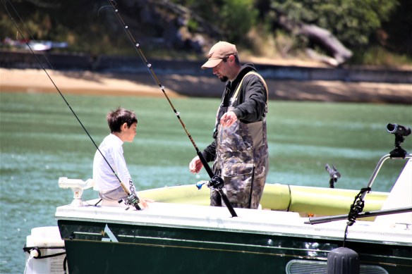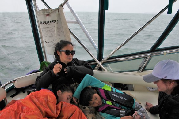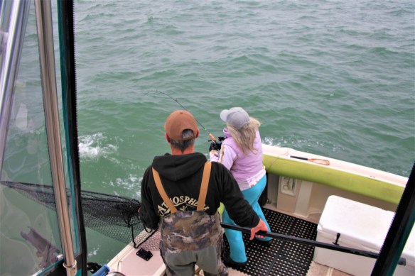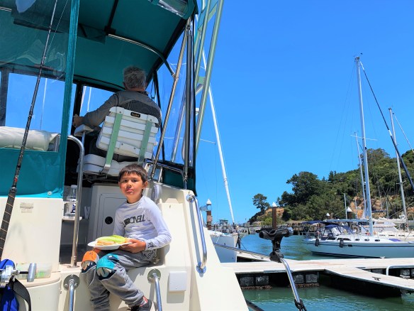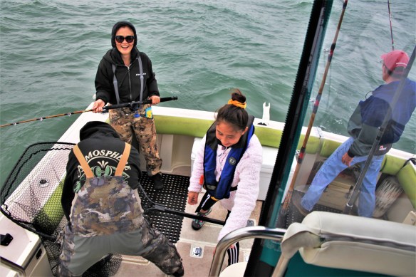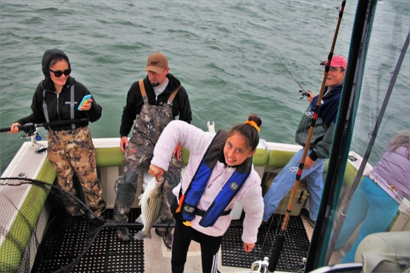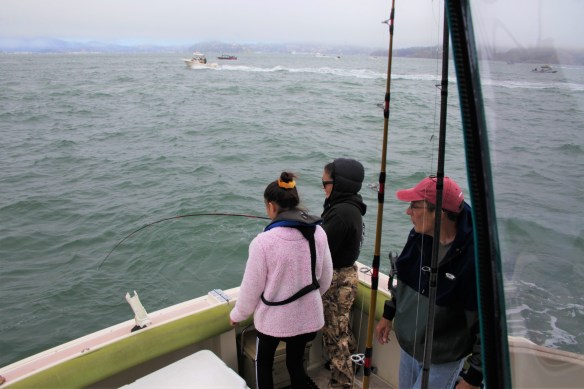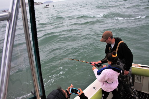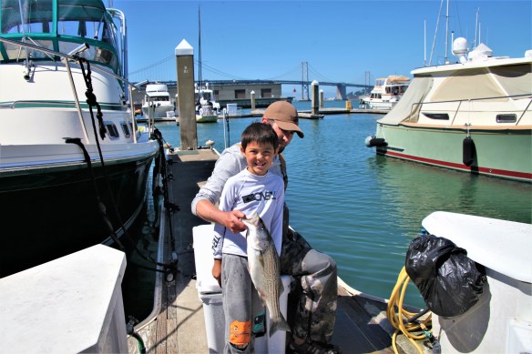 We met Ann, Jeremy, Coral, Dalton, Suzy and Henry at Pier 40 Saturday morning. The bait dock guys were talking rockpile, Alcatraz and SF waterfront in tight. The rocks were loaded with schoolie stripers and we put 10 in the box in short order. The kids were not impressed withe the rockin and rollin you get when 50 boats work the rockpile all at once but perservered. Henry and Jeremy were hookin and handin off.