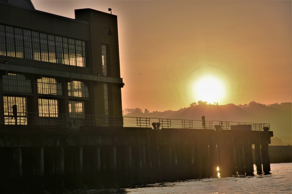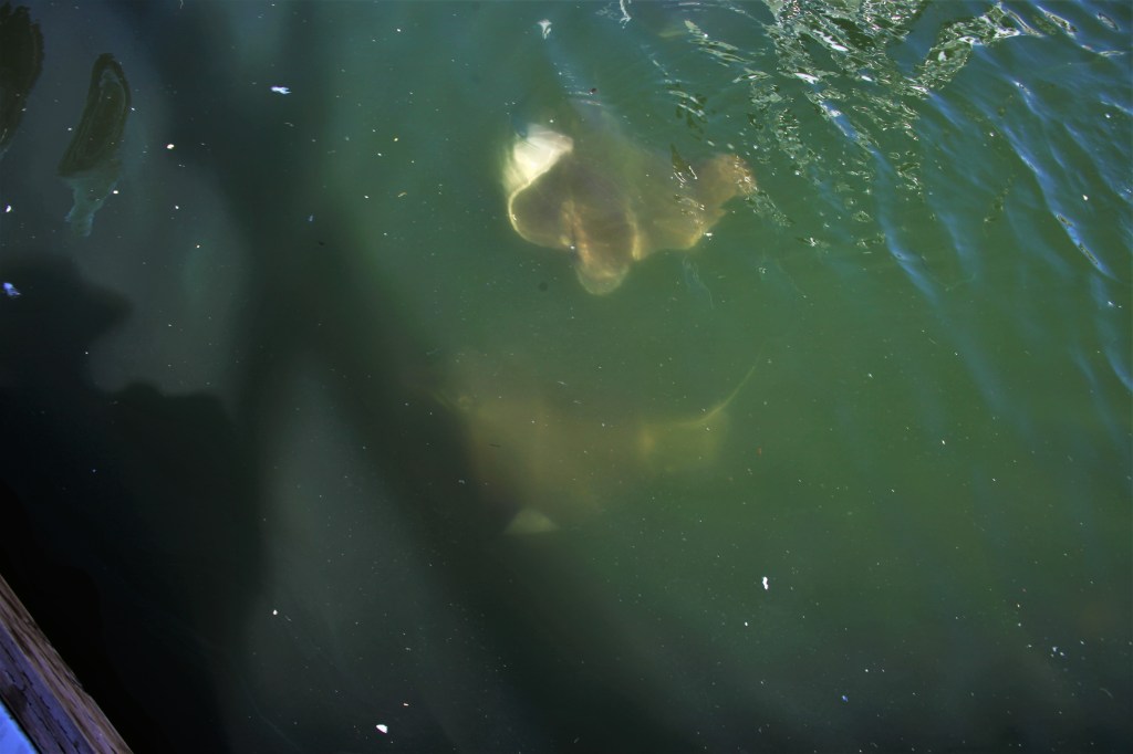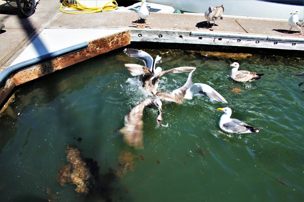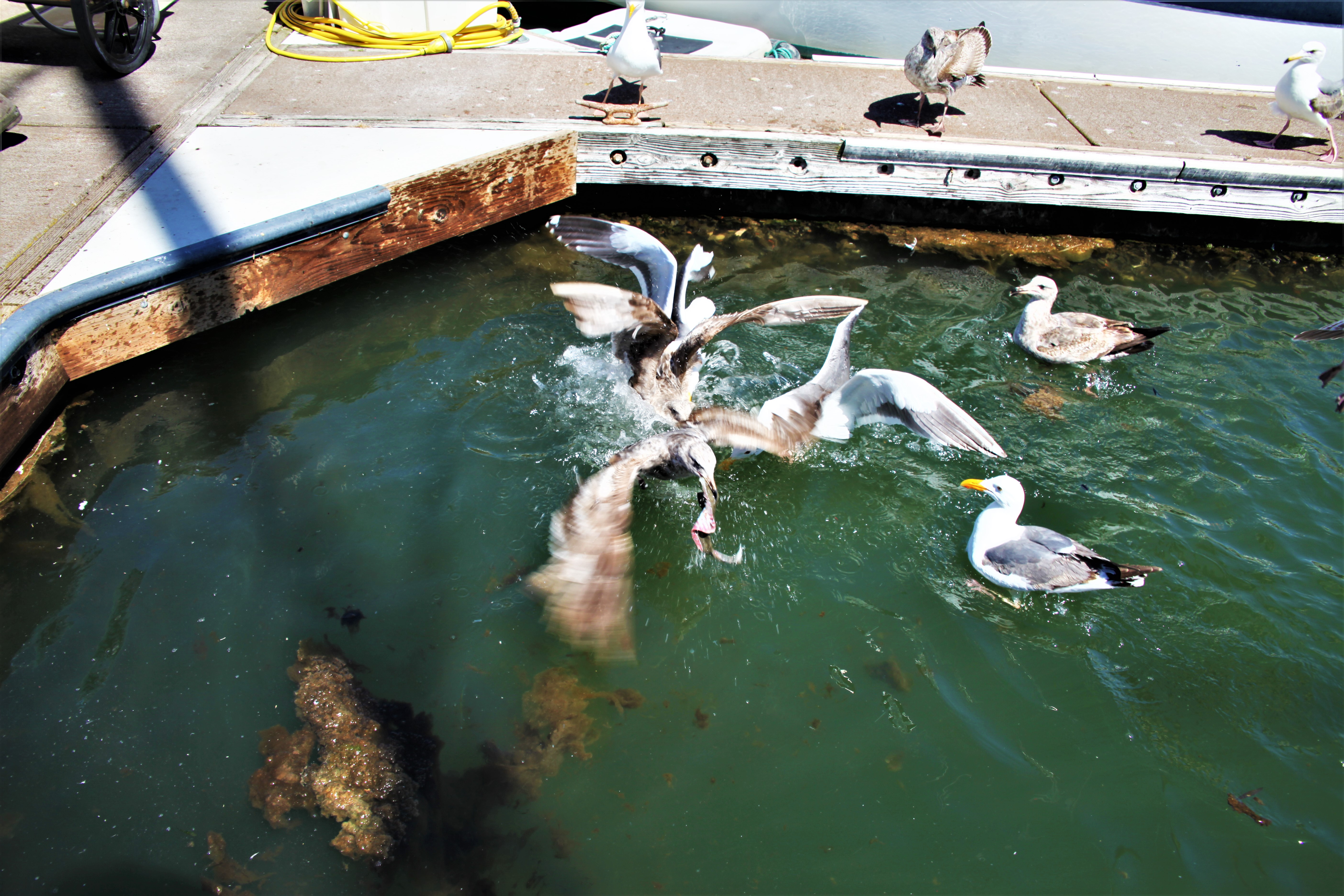 The wildlife scene at the dock for the fish cleaning was there as if they had done this before