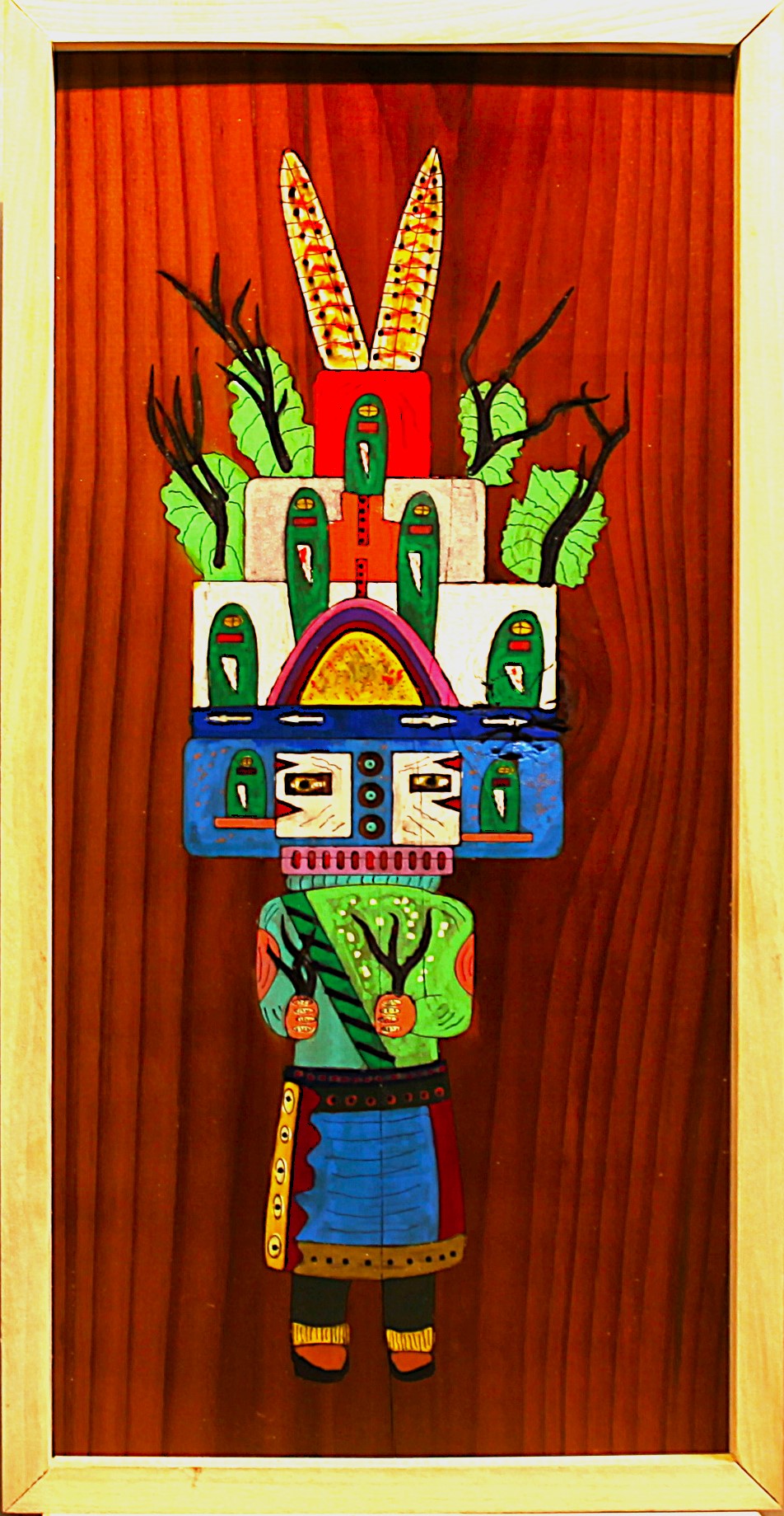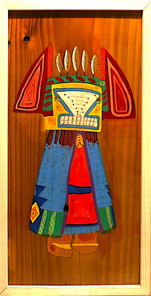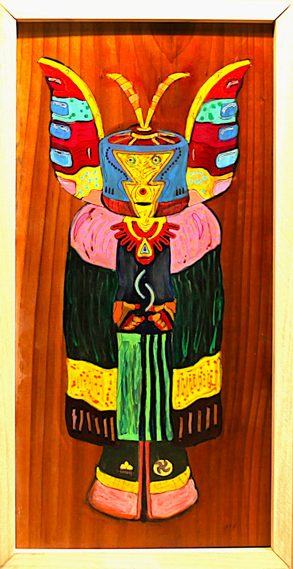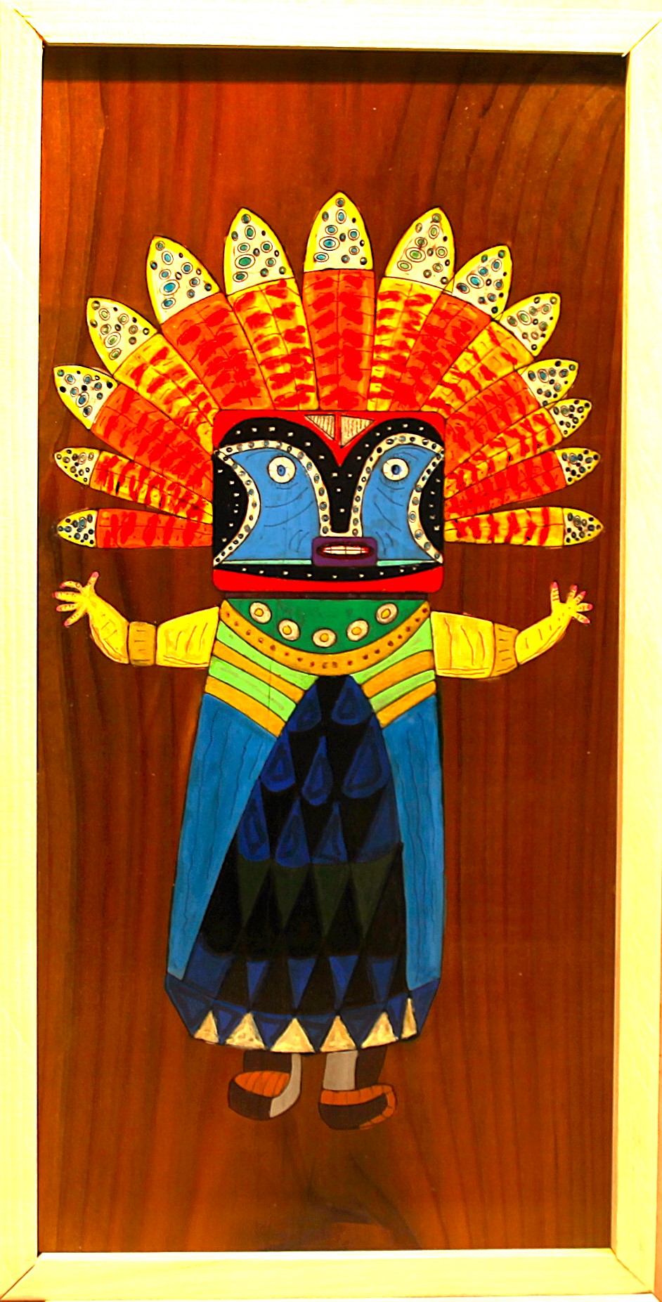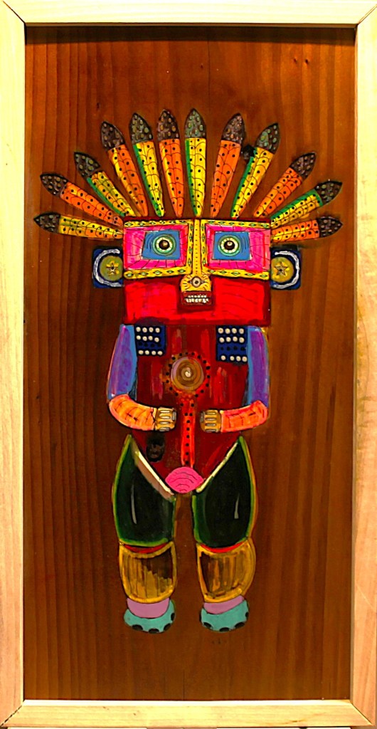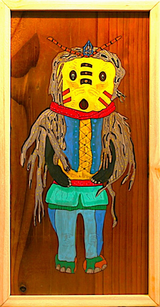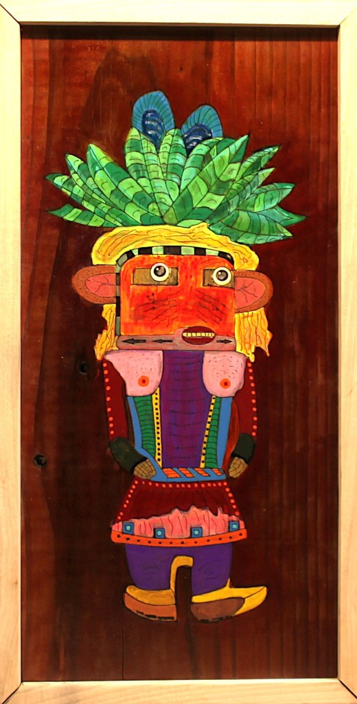 Long ago the aliens came down (or the Indians traveled up) and taught the Indians about fashion. I design these dolls in my sleep which it turns out is cheaper than therapy. Here is a group shot of the last 2 weeks work. Each piece is 15×8 inches. I use old redwood fence boards run through a planer. I draw the golems in Corel Draw (no haters please) as vector files and use a Trotec laser to engrave the outlines. Each piece takes 3-4 hours to paint/detail using Posca pens alcohol inks and fine markers for nose hairs, pimples etc. Finally 3 coats of poly before framing in poplar. Vote for the one you like best!