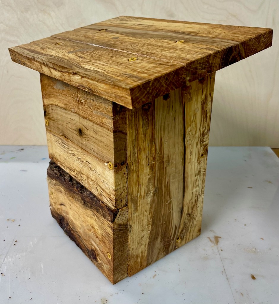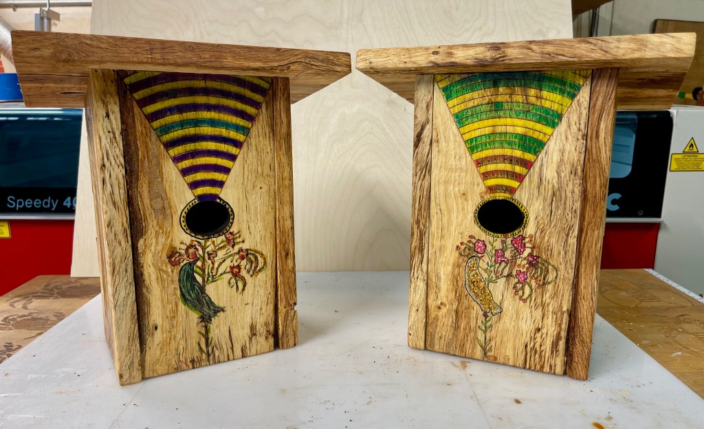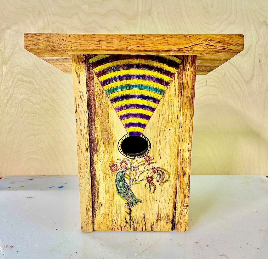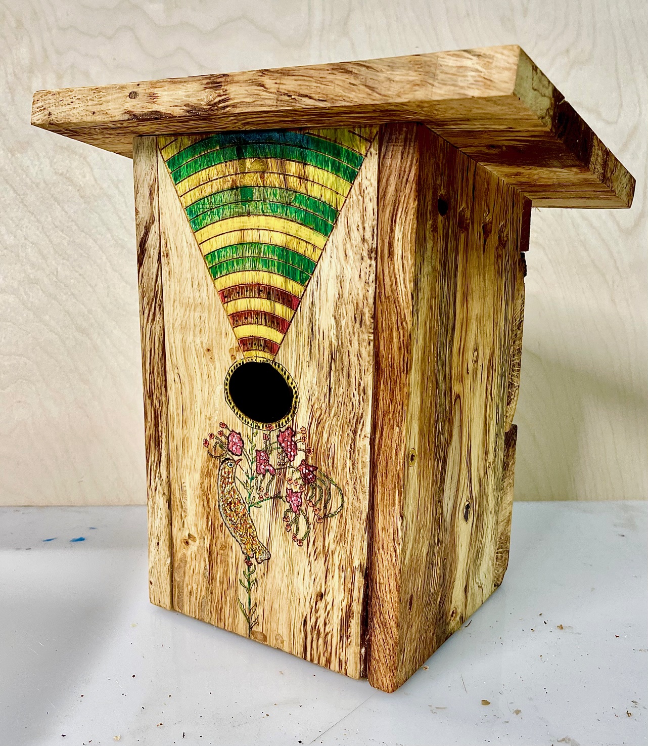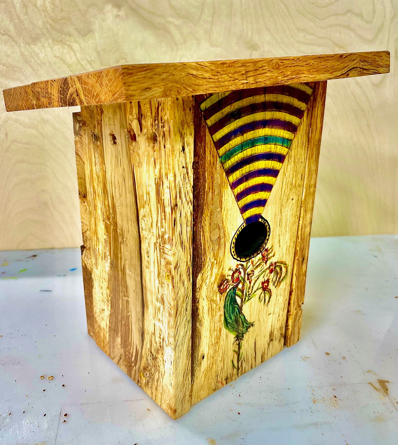 I have been busy over the last week breaking down logs into boards for birdhouses. It is quite satisfying to scavenge logs “found on ground” to use on projects. It is pretty easy to find oak around my neighborhood but I always have my eyes peeled while driving for roadside finds. I had enough semi-dry oak laying around to whip out these two rustic houses. The wood was both spalted and buggy with some really intense grain. All boards were sawn to 3/4 inch thick so the finished product is very beefy. I used the laser to etch the birds and plants and spent a few hours painting them. Screw and glue construction. Boiled linseed oil finish on all exterior surfaces, no finish on the inside.